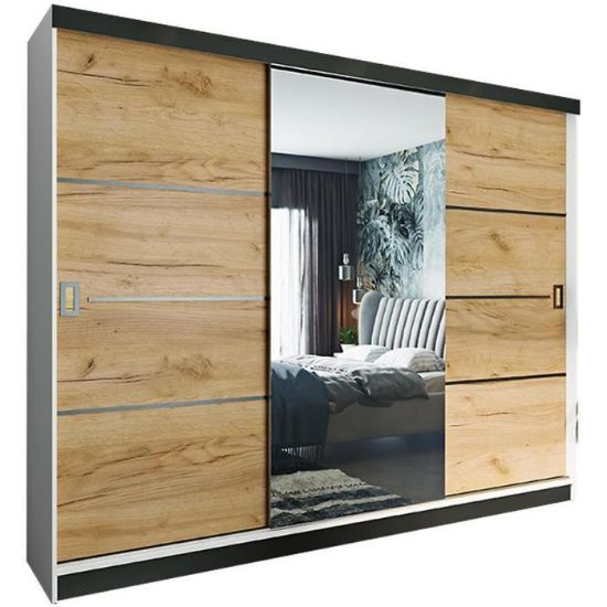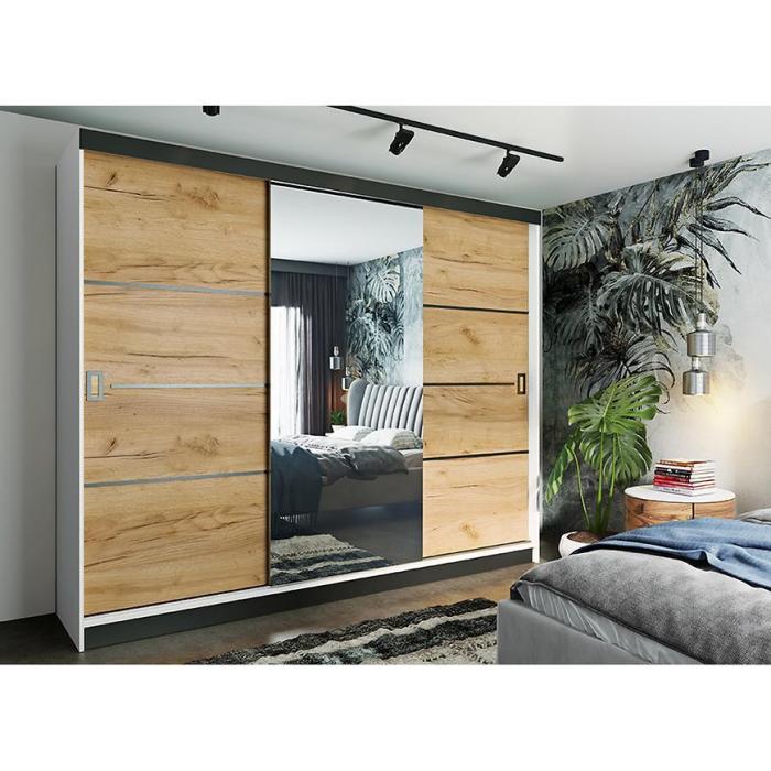 Szafa przesuwna Retro to propozycja do pokoju dziennego, ale znajdzie swoje miejsce również w innym pomieszczeniu, jak na przykład - przedpokój czy garderobie. Materiał wykonania to płyta wiórowa laminowana. Szafa posiada lustro, które sprawi, że pomieszczenie stanie się optycznie większe. Nowoczesny styl mebli wpadnie do gustu każdemu, kto poszukuje eleganckiego, klasycznego, a zarazem nowoczesnego umeblowania. Idealnie wpasuje się w większość aranżacji. Przeznaczona do samodzielnego montażu.