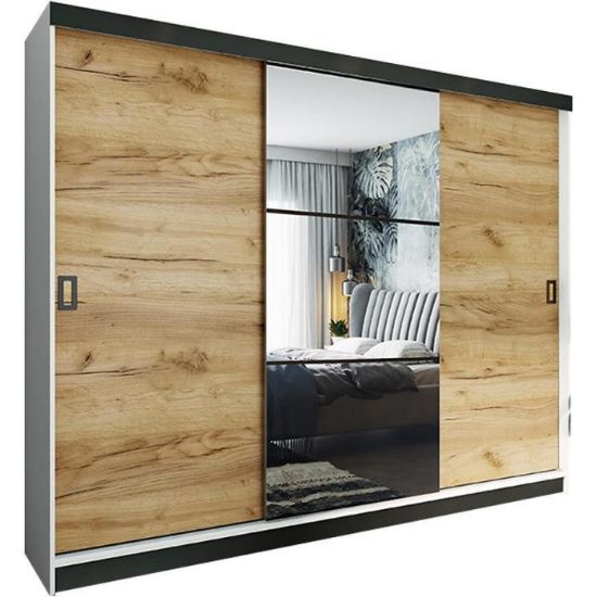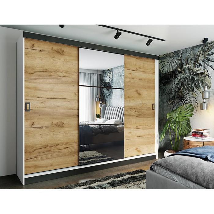 Szafa przesuwna Retro to propozycja do pokoju dziennego, ale znajdzie swoje miejsce również w innym pomieszczeniu, jak na przykład - przedpokój czy garderobie. Materiał wykonania to płyta wiórowa laminowana. Szafa posiada lustro, które sprawi, że pomieszczenie stanie się optycznie większe. Nowoczesny styl mebli wpadnie do gustu każdemu, kto poszukuje eleganckiego, klasycznego, a zarazem nowoczesnego umeblowania. Idealnie wpasuje się w większość aranżacji. Przeznaczona do samodzielnego montażu.