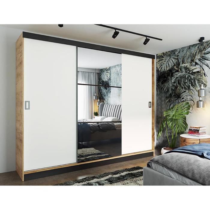 Szafa przesuwna Retro to propozycja do pokoju dziennego, ale znajdzie swoje miejsce również w innym pomieszczeniu, jak na przykład - przedpokój czy garderobie. Materiał wykonania to płyta wiórowa laminowana. Szafa posiada lustro, które sprawi, że pomieszczenie stanie się optycznie większe. Nowoczesny styl mebli wpadnie do gustu każdemu, kto poszukuje eleganckiego, klasycznego, a zarazem nowoczesnego umeblowania. Idealnie wpasuje się w większość aranżacji. Przeznaczona do samodzielnego montażu.
