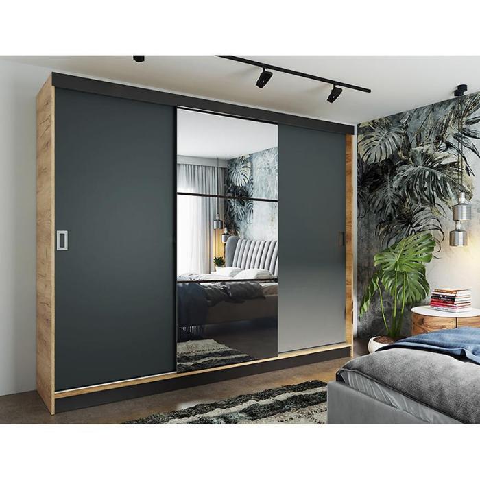 Szafa przesuwna Retro to propozycja do pokoju dziennego, ale znajdzie swoje miejsce również w innym pomieszczeniu, jak na przykład - przedpokój czy garderobie. Materiał wykonania to płyta wiórowa laminowana. Szafa posiada lustro, które sprawi, że pomieszczenie stanie się optycznie większe. Nowoczesny styl mebli wpadnie do gustu każdemu, kto poszukuje eleganckiego, klasycznego, a zarazem nowoczesnego umeblowania. Idealnie wpasuje się w większość aranżacji. Przeznaczona do samodzielnego montażu.