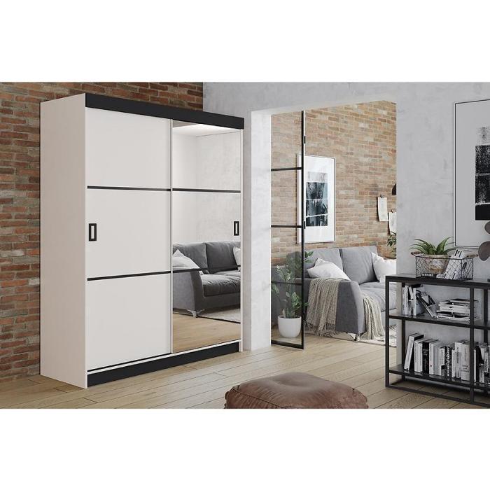 Szafa w kolorze białym/czarny z kolekcji Retro to doskonała propozycja do pokoju dziennego, ale znajdzie swoje miejsce również w innym pomieszczeniu, jak na przykład - przedpokój czy garderobie, sypialni. Materiał wykonania to płyta laminowana. Szafa posiada półki, drążek na ubrania. Czarne wstawki i minimalistyczne elementy w postaci rączek dodają charakteru. Szafa dostępna w wersji z lustrem, dlatego właściciele mniejszych mieszkań z pewnością docenią takie rozwiązanie, nie musząc gospodarować dodatkowej przestrzeni na lustro. Wygląd szafy sprawi, że wpasuje się w większość aranżacji. Szafa będzie świetnym miejscem do wieszania ubrań, na buty lub inne domowe tekstylia. Nowoczesny styl mebli wpadnie do gustu każdemu, kto poszukuje eleganckiego, klasycznego, a zarazem nowoczesnego umeblowania. Szafa przeznaczona do samodzielnego montażu.