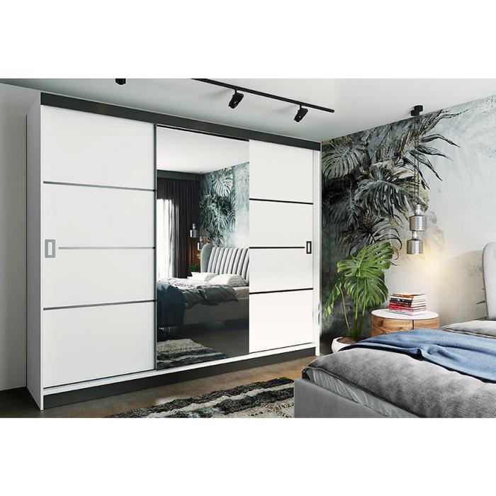 Szafa w kolorze białym/czarny z kolekcji Retro to doskonała propozycja do pokoju dziennego, ale znajdzie swoje miejsce również w innym pomieszczeniu, jak na przykład - przedpokój czy garderobie, sypialni. Materiał wykonania to płyta laminowana. Szafa posiada półki, drążek na ubrania. Czarne wstawki i minimalistyczne elementy w postaci rączek dodają charakteru. Szafa dostępna w wersji z lustrem, dlatego właściciele mniejszych mieszkań z pewnością docenią takie rozwiązanie, nie musząc gospodarować dodatkowej przestrzeni na lustro. Wygląd szafy sprawi, że wpasuje się w większość aranżacji. Szafa będzie świetnym miejscem do wieszania ubrań, na buty lub inne domowe tekstylia. Nowoczesny styl mebli wpadnie do gustu każdemu, kto poszukuje eleganckiego, klasycznego, a zarazem nowoczesnego umeblowania. Szafa przeznaczona do samodzielnego montażu.