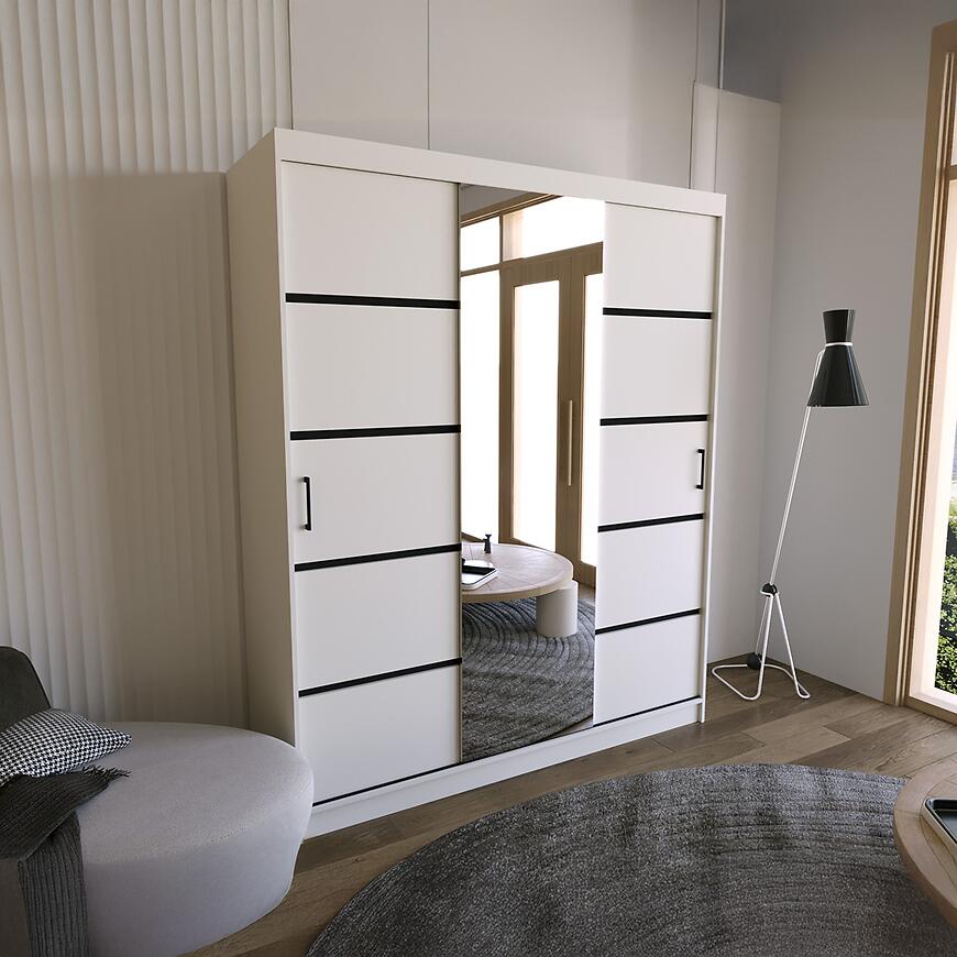 Szafa Rio 180 kaszmir łączy w sobie funkcjonalność i elegancki wygląd. Wyposażona w trzy drzwi z wygodnym systemem przesuwnym i uchylnym oraz praktyczne lustro, pozwala na łatwą organizację i optyczne powiększenie wnętrza. Solidna konstrukcja z płyty laminowanej w odcieniu kashmir prezentuje się nowocześnie i stylowo, a matowe wykończenie dodaje subtelnej elegancji. To pojemna i praktyczna szafa, która sprawdzi się w codziennym użytkowaniu i podkreśli charakter aranżacji.