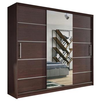 Szafa przesuwna w kolorze wenge z serii Rio to doskonała propozycja do pokoju dziennego, dziecka, młodzieżowego, ale znajdzie swoje miejsce również w innym pomieszczeniu, jak na przykład - przedpokój czy garderobie, sypialni. Materiał wykonania to płyta laminowana. Szafa posiada półki oraz drążek na ubrania. Szafa posiada również lustro, które sprawi, że pomieszczenie stanie się optycznie większe. Mebel będzie świetnym miejscem do wieszania ubrań, na buty lub inne domowe tekstylia. Nowoczesny styl mebli wpadnie do gustu każdemu, kto poszukuje eleganckiego, klasycznego, a zarazem nowoczesnego umeblowania. Idealnie wpasuje się w większość aranżacji. Przeznaczona do samodzielnego montażu.