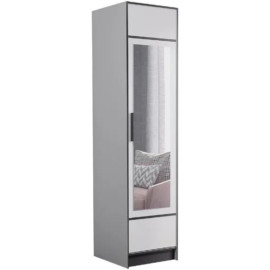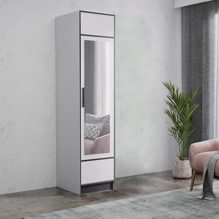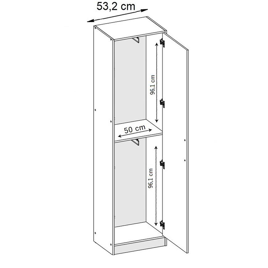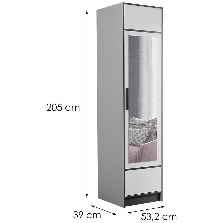 Szafa ROJ z kolekcji ROJ to idealne rozwiązanie do sypialni, przedpokoju czy garderoby. Dzięki klasycznym drzwiom, wbudowanemu lustru oraz praktycznemu wnętrzu z półkami i drążkiem na ubrania, ta szafa łączy funkcjonalność z nowoczesnym stylem.