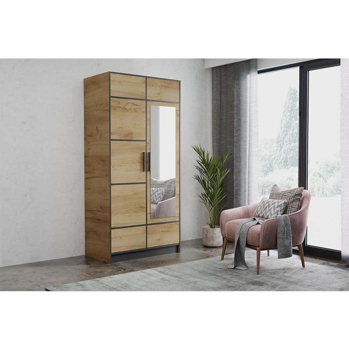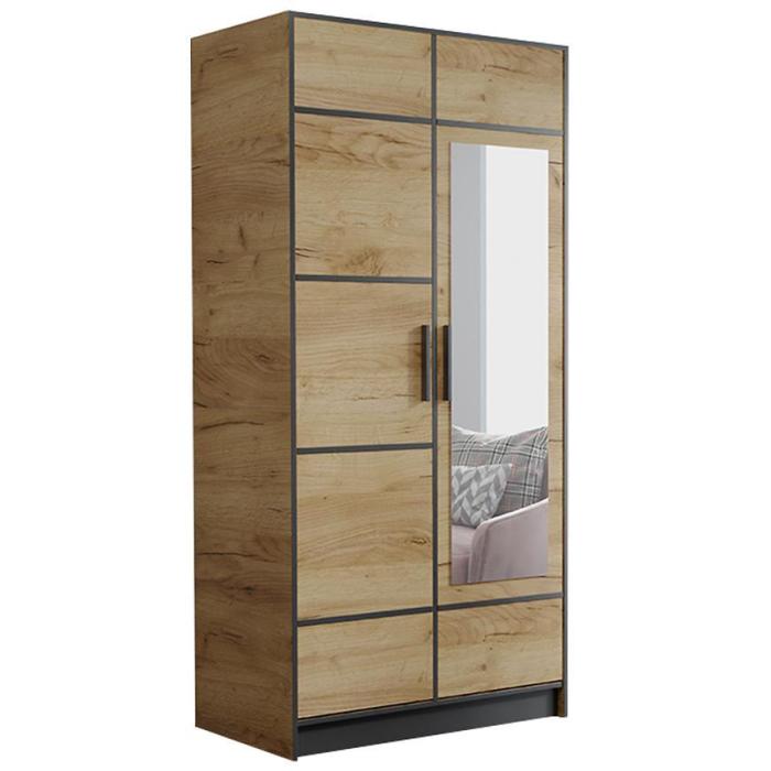 Szafa uchylna Roj to propozycja do pokoju dziennego, ale znajdzie swoje miejsce również w innym pomieszczeniu, jak na przykład - przedpokój czy garderobie. Materiał wykonania to płyta wiórowa laminowana. Szafa posiada półki oraz drążek na ubrania. Mebel posiada lustro, które sprawi, że pomieszczenie stanie się optycznie większe. Nowoczesny styl mebli wpadnie do gustu każdemu, kto poszukuje eleganckiego, klasycznego, a zarazem nowoczesnego umeblowania. Idealnie wpasuje się w większość aranżacji. Przeznaczona do samodzielnego montażu.