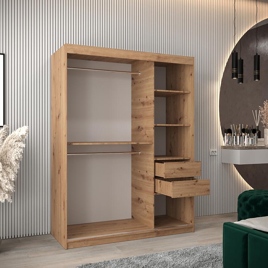 Szafa Rossa 150 w kolorze artisan to funkcjonalny mebel do sypialni, garderoby czy przedpokoju. Szerokość 150 cm pozwala na komfortowe przechowywanie ubrań i akcesoriów, jednocześnie zachowując nowoczesną linię i estetykę wnętrza. Jasny, drewnopodobny odcień Artisan dodaje ciepła i naturalnego charakteru pomieszczeniu.