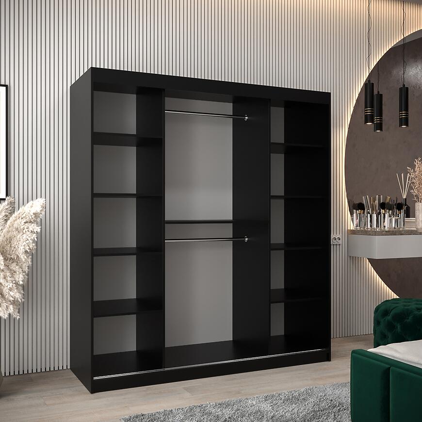 Szafa Rossa 180 czarny to elegancki i funkcjonalny mebel, który sprawdzi się w sypialni, garderobie oraz przedpokoju. Model z kolekcji ROSSA o szerokości 180 cm oferuje dużą przestrzeń do przechowywania ubrań, dodatków i tekstyliów domowych. Głęboki, czarny kolor frontów i korpusu w matowym wykończeniu nadaje wnętrzu nowoczesny i wyrazisty charakter, idealnie wpisując się w minimalistyczne oraz loftowe aranżacje.