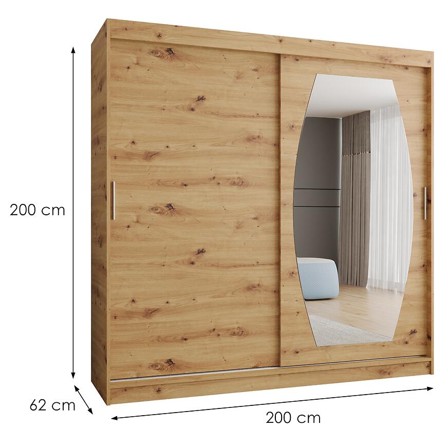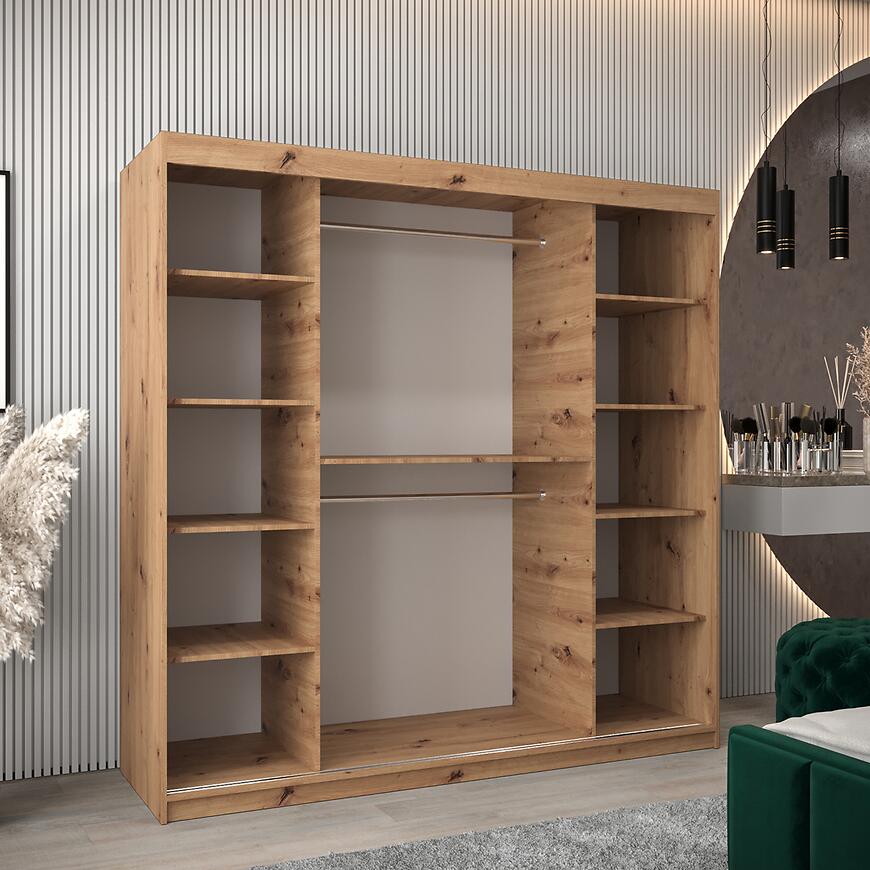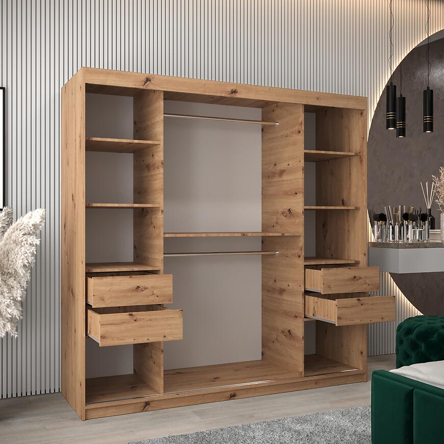 Szafa Rossa 200 artisan to elegancki i funkcjonalny mebel, idealny do większych sypialni, garderób oraz przedpokojów. Model z kolekcji ROSSA o szerokości 200 cm oferuje pojemną powierzchnię do przechowywania ubrań, dodatków i tekstyliów domowych. Jasne, drewnopodobne wybarwienie dąb artisan w matowym wykończeniu wprowadza do wnętrza naturalny i przytulny charakter, harmonijnie komponując się z nowoczesnymi aranżacjami wnętrz.
