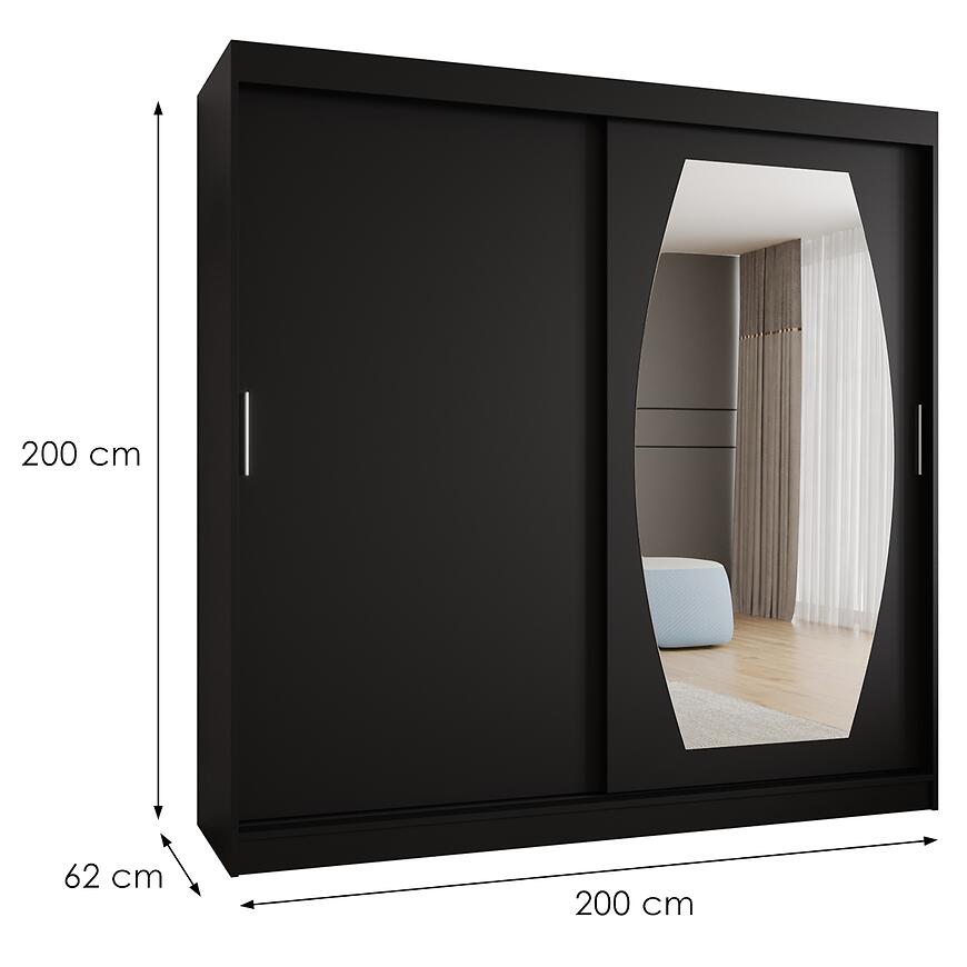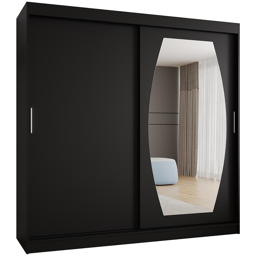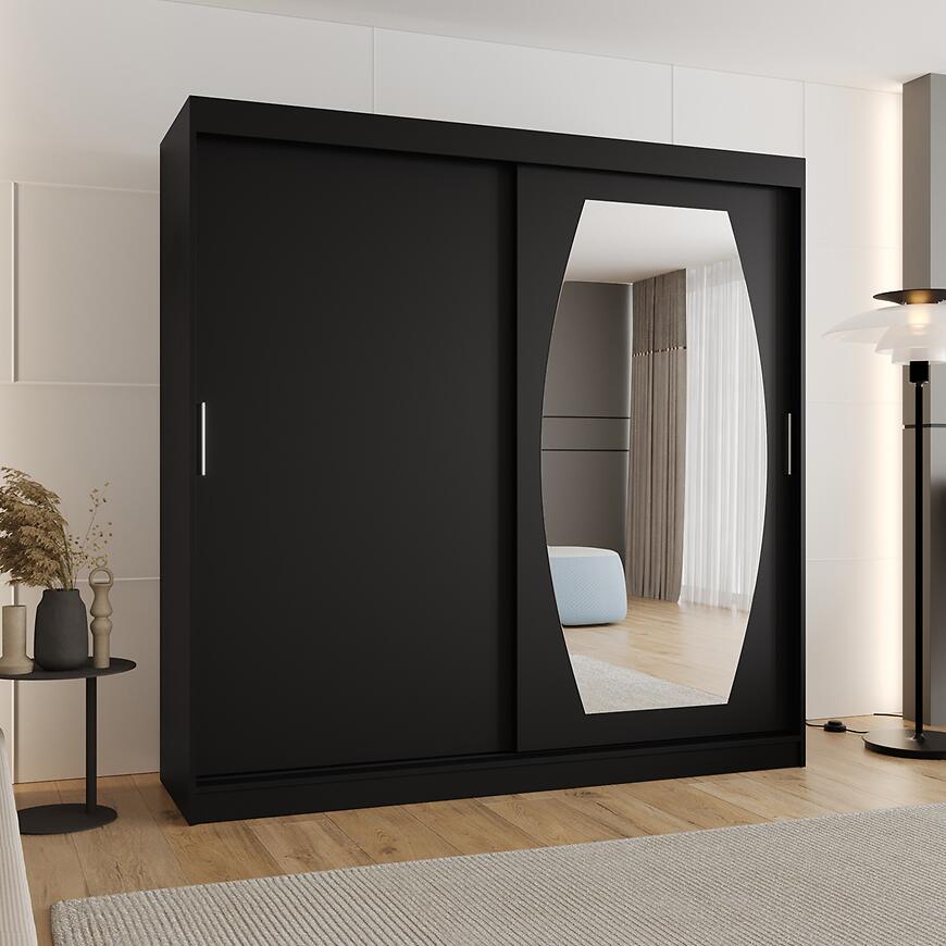 Szafa Rossa 200 czarny to idealny wybór dla osób poszukujących praktycznej, dwudrzwiowej szafy przesuwnej z lustrem. Doskonale sprawdzi się jako mebel do sypialni lub garderoby, wprowadzając do wnętrza porządek, nowoczesny styl i wyrazistość.