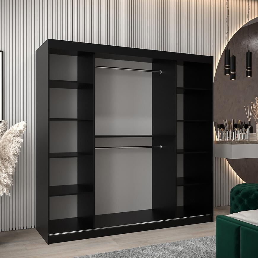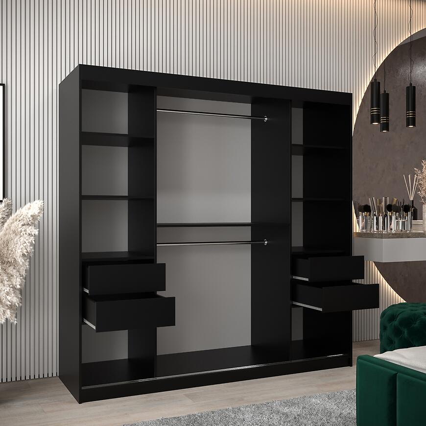 Szafa Rossa 200 czarny to elegancki i funkcjonalny mebel, idealny do większych sypialni, garderób oraz przedpokojów. Model z kolekcji ROSSA o szerokości 200 cm oferuje przestronną powierzchnię do przechowywania ubrań, dodatków i tekstyliów domowych. Głęboka czarna kolorystyka frontów i korpusu w matowym wykończeniu wprowadza do wnętrza nowoczesny, wyrazisty charakter, harmonijnie komponując się z minimalistycznymi i loftowymi aranżacjami wnętrz.