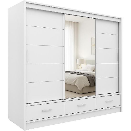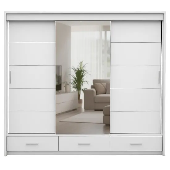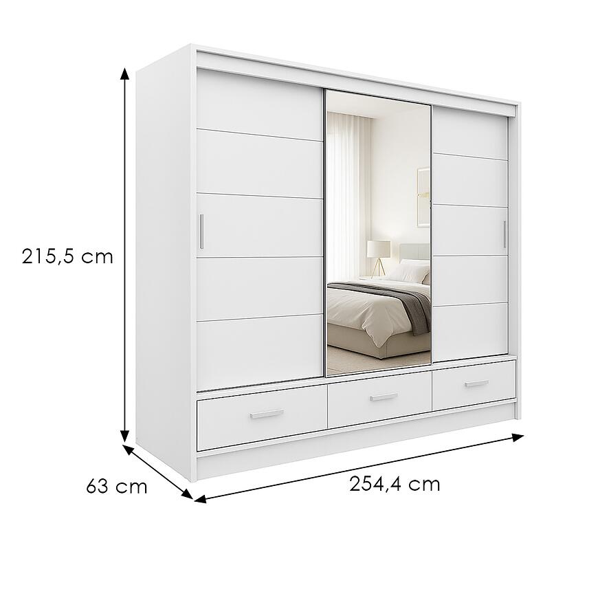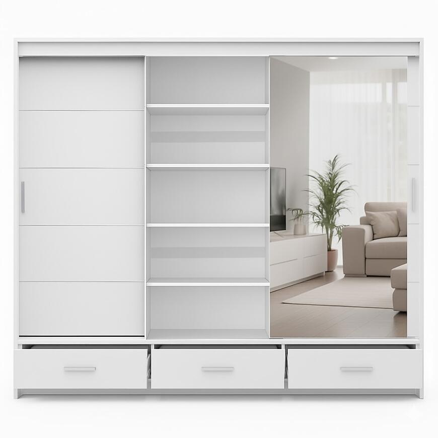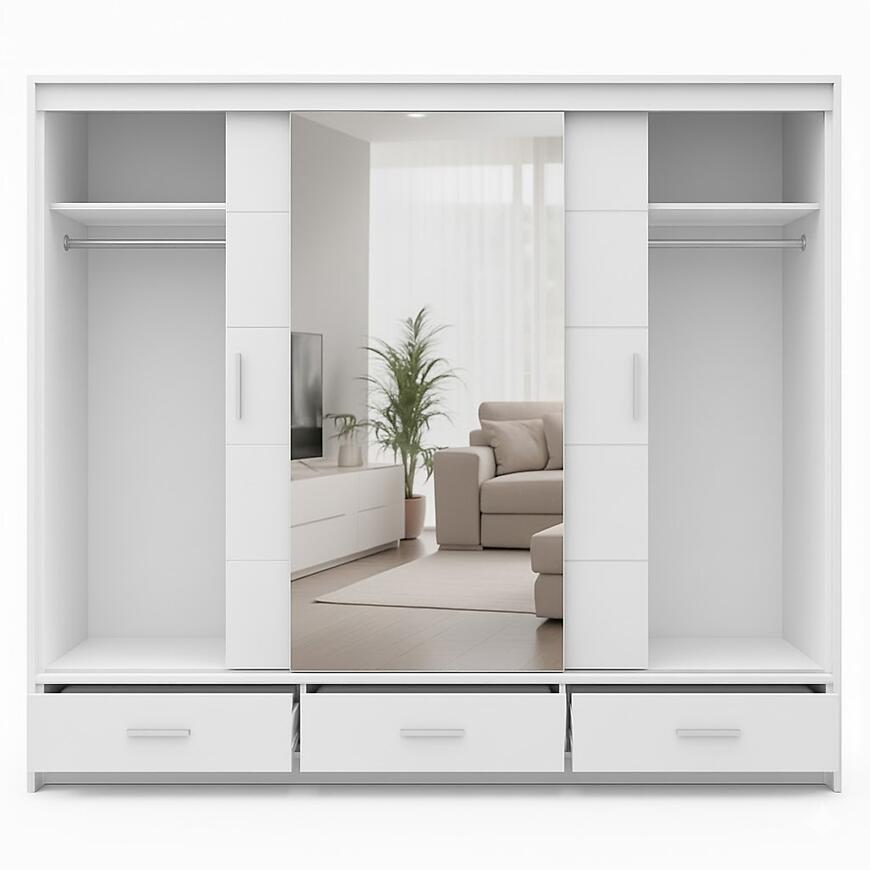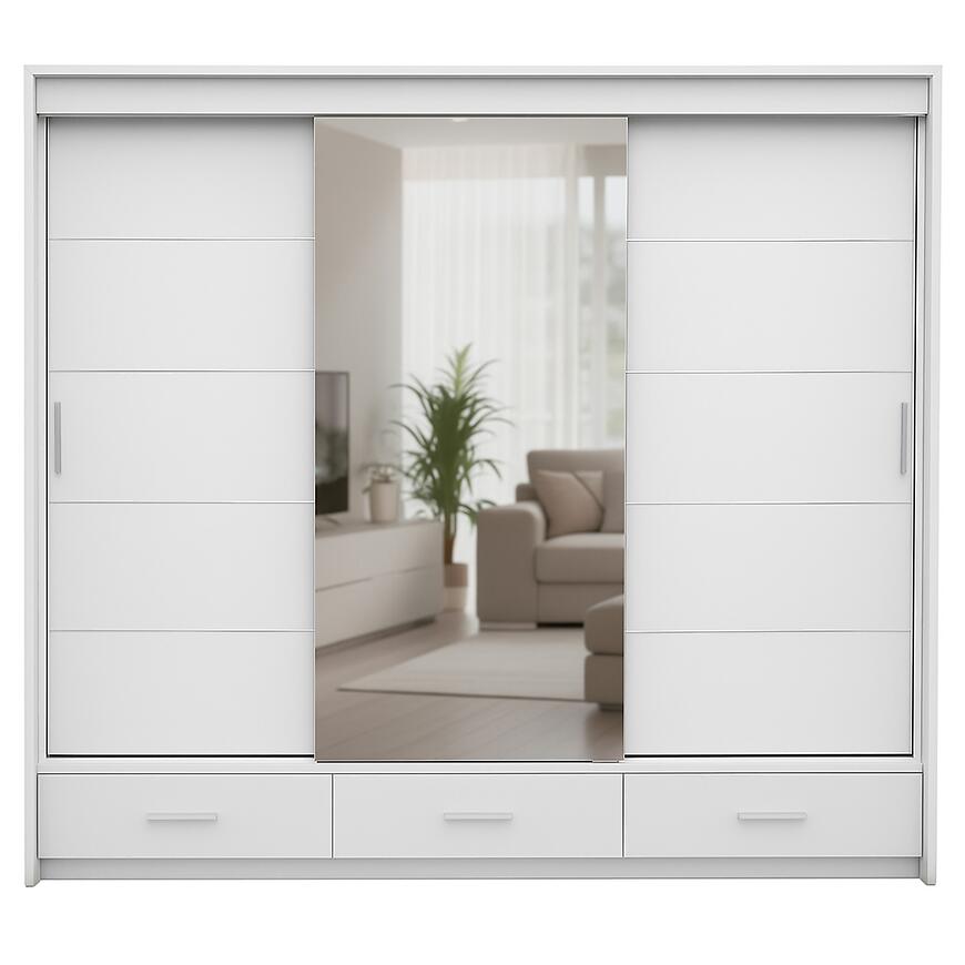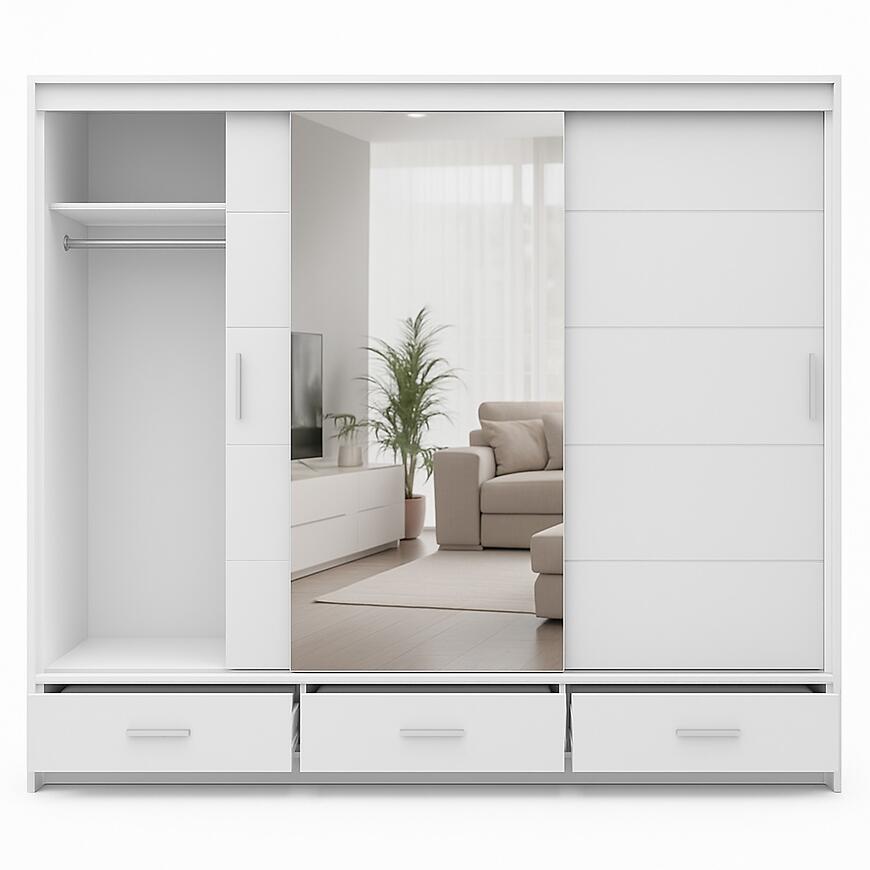 Szafa Rossa 250 Biała łączy przestronność, nowoczesny design i funkcjonalność. Trzydrzwiowa konstrukcja z lustrem, trzy szuflady oraz matowe wykończenie tworzą praktyczny i elegancki mebel, który pozwala utrzymać porządek, jednocześnie wprowadzając do wnętrza lekkość i nowoczesny charakter.