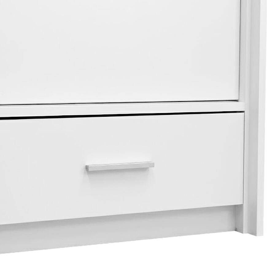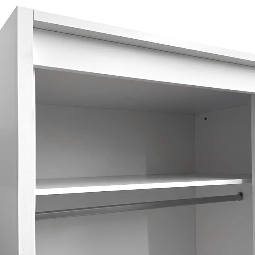 Fronty i korpus szafy wykonano z laminowanej płyty wiórowej, co zapewnia stabilność i trwałość mebla. Matowe wykończenie w eleganckiej bieli sprawia, że szafa wprowadza do wnętrza lekkość i nowoczesny styl, jednocześnie pozostając łatwą w utrzymaniu w czystości. Proste linie i minimalistyczny charakter czynią szafę uniwersalną i ponadczasową.