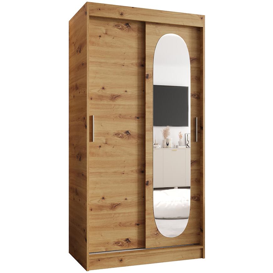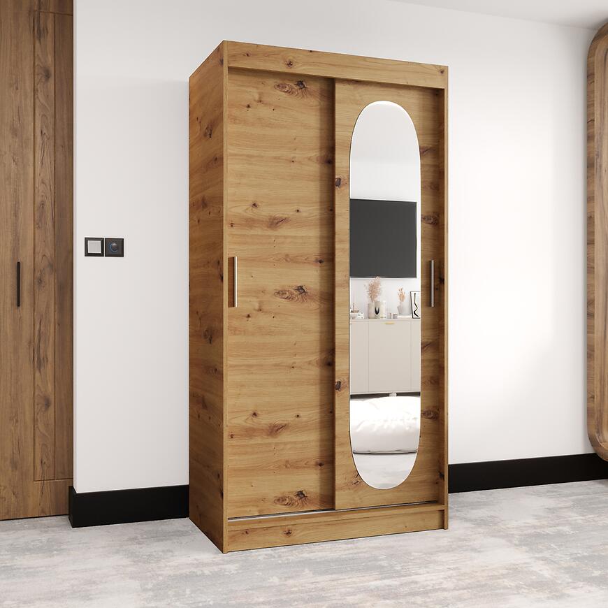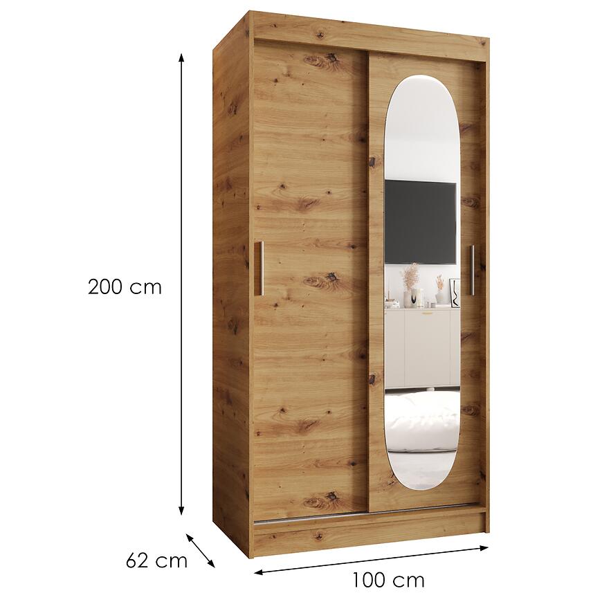 Szafa Royal 100 artisan to doskonały wybór dla osób poszukujących praktycznej, dwudrzwiowej szafy przesuwnej z lustrem. Sprawdzi się jako mebel do sypialni lub garderoby, wprowadzając do wnętrza ciepło, porządek i harmonijną estetykę.