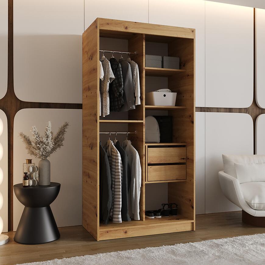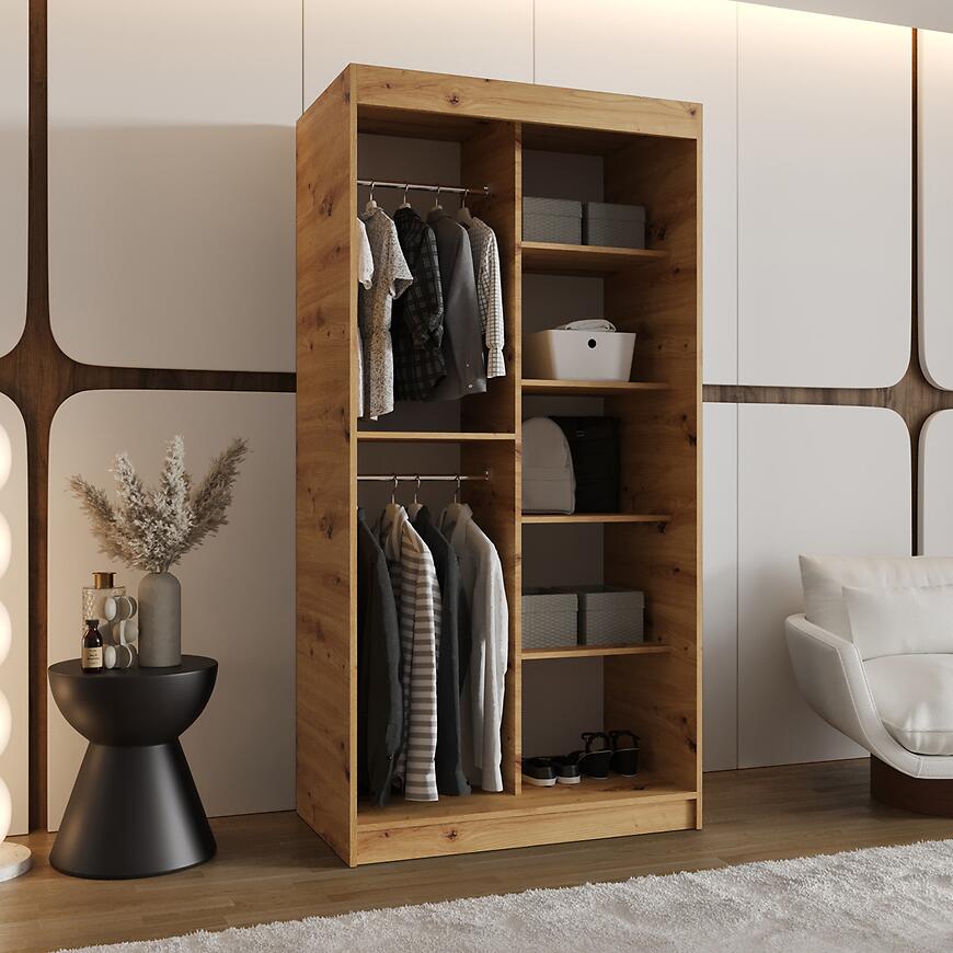 Szafa Royal 100 artisan to funkcjonalny i elegancki mebel, idealny do mniejszych sypialni, garderób oraz przedpokojów. Model z kolekcji ROYAL o szerokości 100 cm oferuje wygodną przestrzeń do przechowywania ubrań, dodatków oraz tekstyliów domowych. Jasne, drewnopodobne wybarwienie dąb artisan wprowadza do wnętrza przytulny, naturalny charakter, harmonijnie łącząc się z nowoczesnymi aranżacjami.