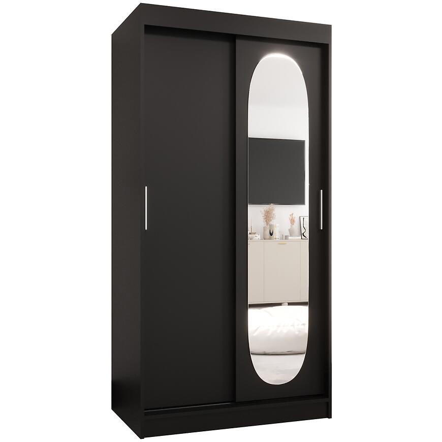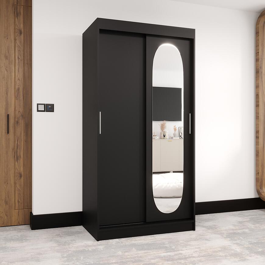 Szafa Royal 100 czarny to idealny wybór dla osób poszukujących praktycznej, dwudrzwiowej szafy przesuwnej z lustrem. Doskonale sprawdzi się jako mebel do sypialni lub garderoby, wprowadzając do wnętrza elegancję, porządek i nowoczesny charakter.