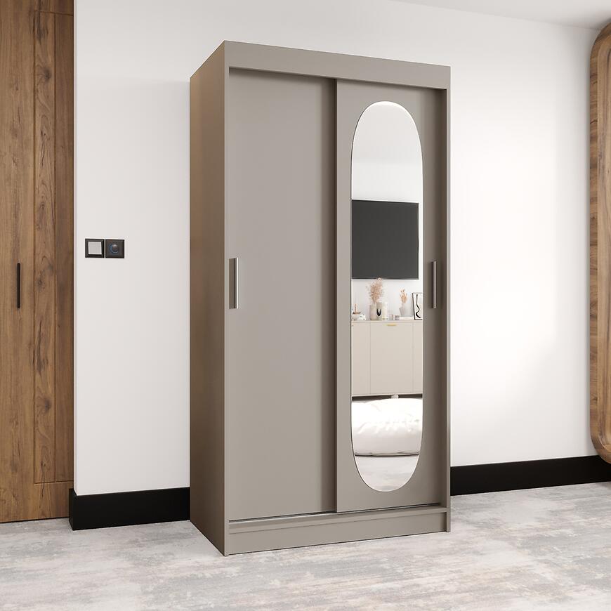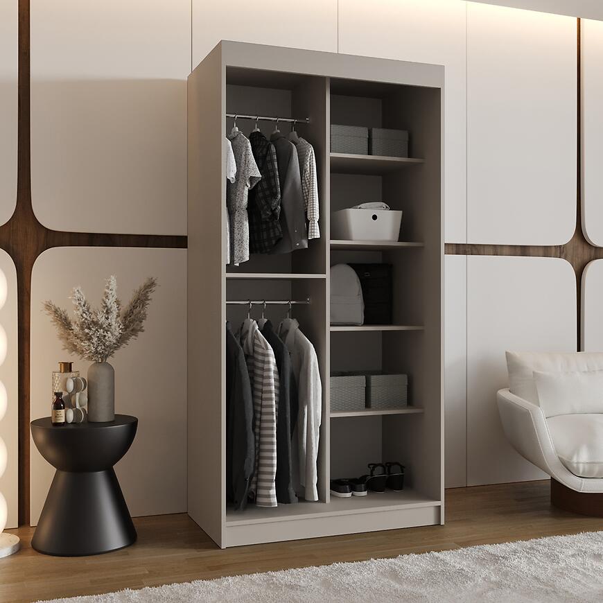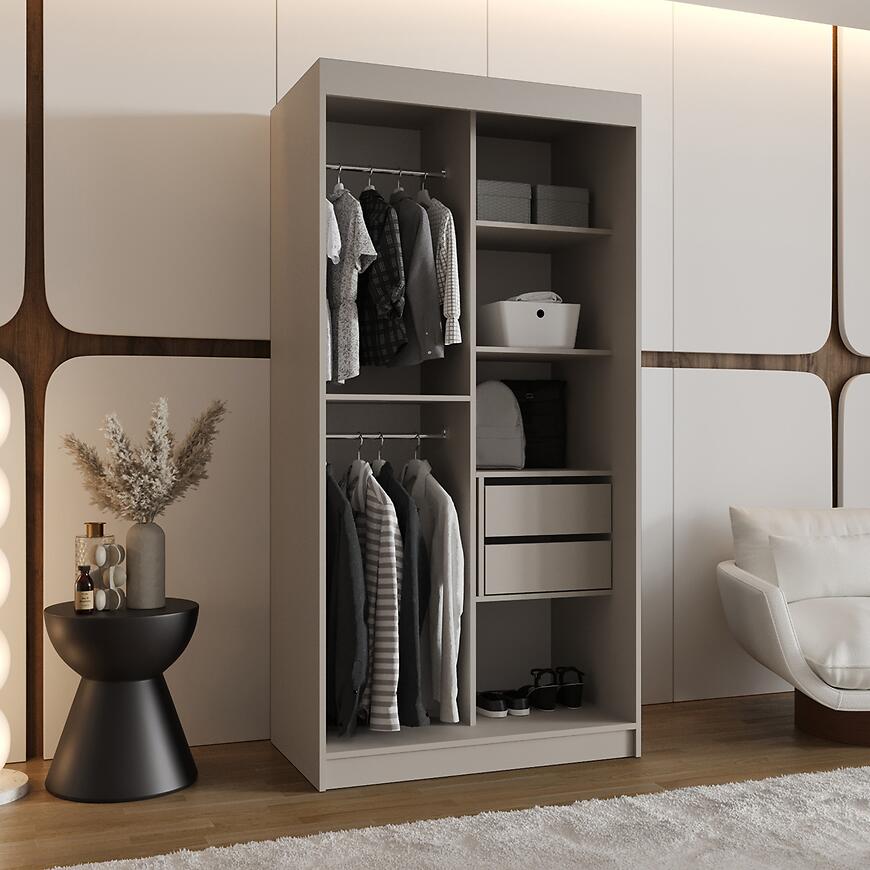 Dwudrzwiowa konstrukcja z drzwiami przesuwnymi umożliwia komfortowy dostęp do wnętrza szafy bez konieczności pozostawiania dodatkowej przestrzeni przed meblem. Wbudowane lustro ułatwia codzienne przygotowania i optycznie powiększa pomieszczenie, nadając wnętrzu wrażenie przestronności i porządku. Matowe wykończenie frontów i korpusu podkreśla elegancki i subtelny charakter mebla.