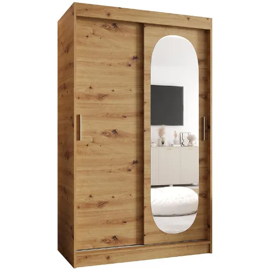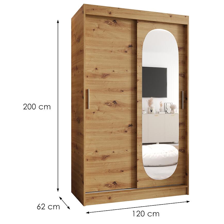 Szafa Royal 120 artisan to idealny wybór dla osób poszukujących praktycznej, dwudrzwiowej szafy przesuwnej z lustrem. Doskonale sprawdzi się jako mebel do sypialni lub garderoby, wprowadzając do wnętrza ciepło, porządek i harmonijną estetykę.
