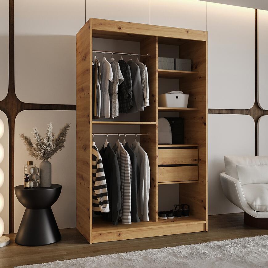 Szafa Royal 120 artisan to elegancki i funkcjonalny mebel, idealny do średniej wielkości sypialni, garderób oraz przedpokojów. Model z kolekcji ROYAL o szerokości 120 cm oferuje wygodną przestrzeń do przechowywania ubrań, dodatków i tekstyliów domowych. Jasne, drewnopodobne wybarwienie dąb artisan wprowadza do wnętrza przytulny, naturalny charakter, harmonijnie komponując się z nowoczesnymi aranżacjami wnętrz.