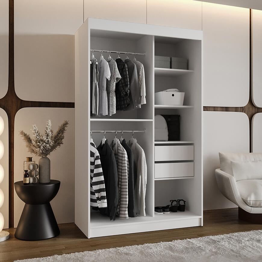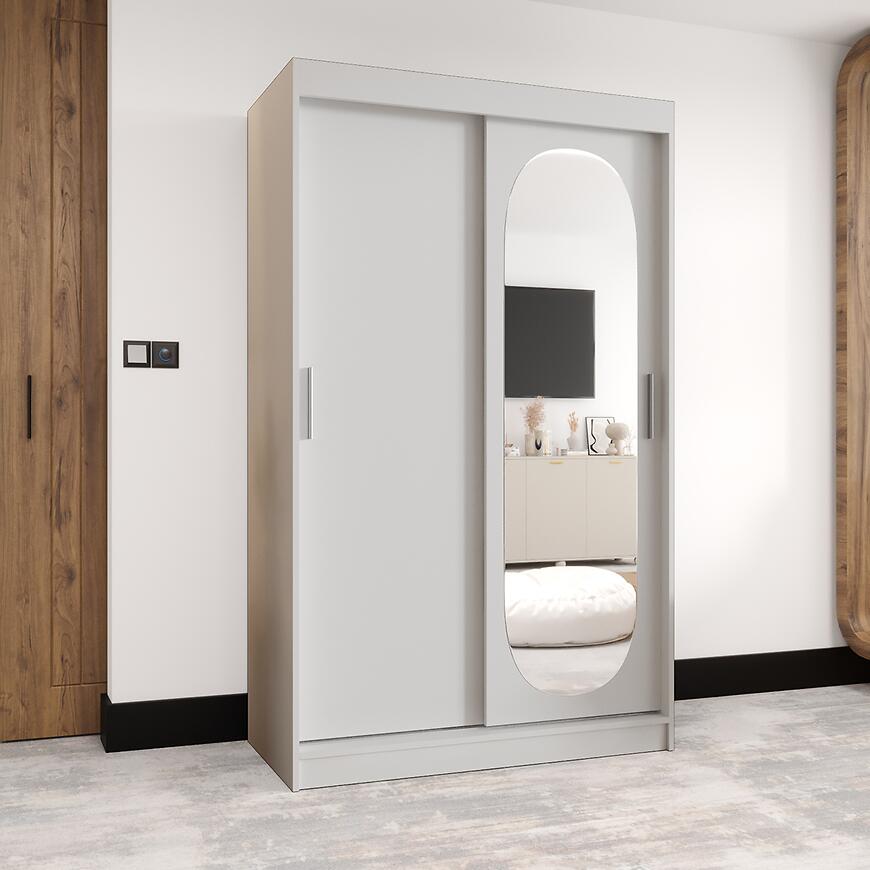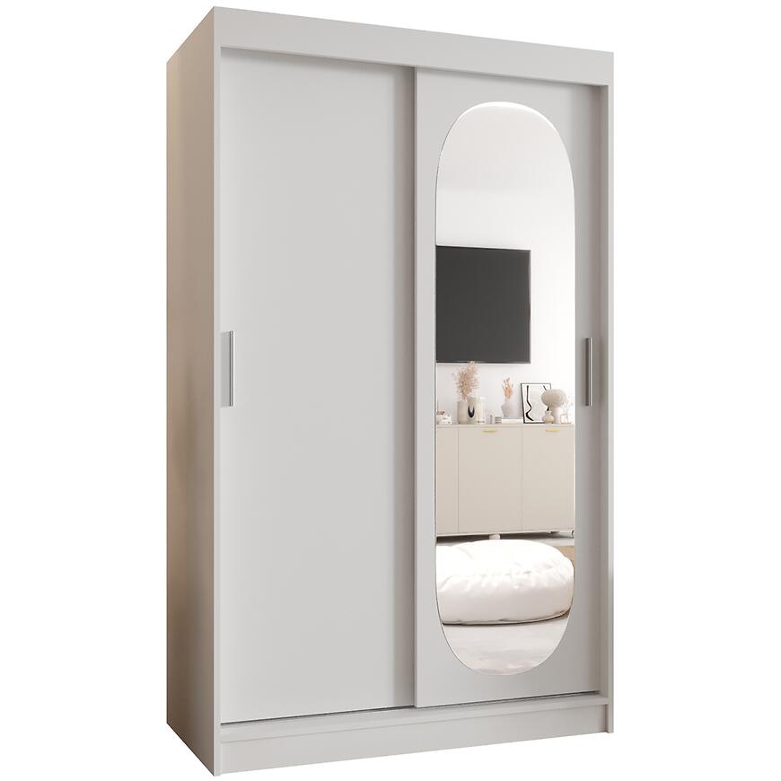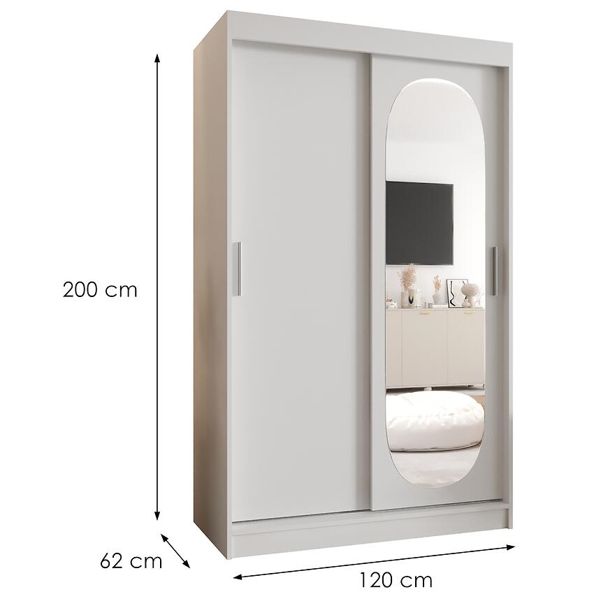 Szafa Royal 120 biały to idealny wybór dla osób poszukujących praktycznej, dwudrzwiowej szafy przesuwnej z lustrem. Doskonale sprawdzi się jako mebel do sypialni lub garderoby, wprowadzając do wnętrza świeżość, porządek i harmonijną estetykę.