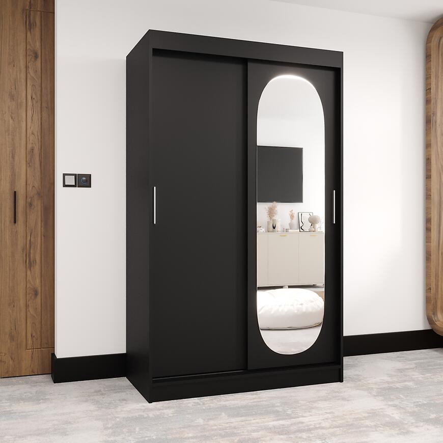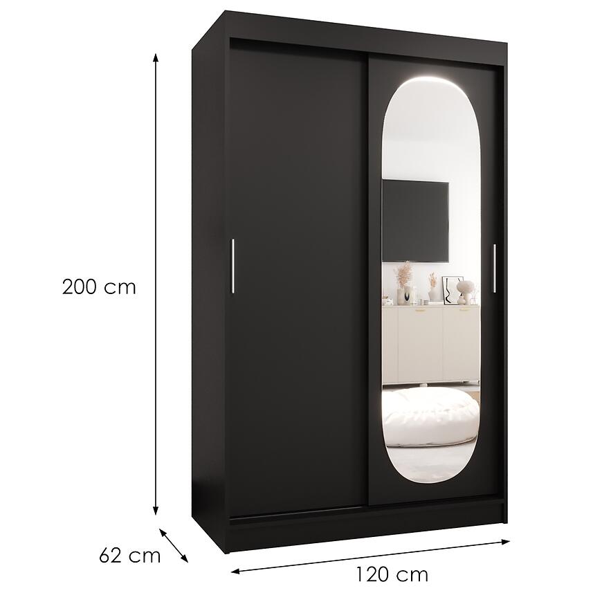 Szafa Royal 120 czarny to idealny wybór dla osób poszukujących praktycznej, dwudrzwiowej szafy przesuwnej z lustrem. Doskonale sprawdzi się jako mebel do sypialni lub garderoby, wprowadzając do wnętrza elegancję, porządek i nowoczesny charakter.