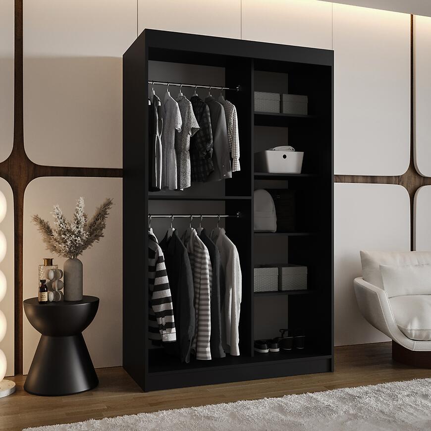 Szafa Royal 120 czarny to elegancki i funkcjonalny mebel, który doskonale sprawdzi się w średniej wielkości sypialniach, garderobach oraz przedpokojach. Model z kolekcji ROYAL o szerokości 120 cm oferuje wygodną przestrzeń do przechowywania ubrań, dodatków oraz tekstyliów domowych. Głęboki, czarny kolor frontów i korpusu w matowym wykończeniu nadaje wnętrzu wyrazistości i nowoczesnego charakteru, harmonijnie komponując się z minimalistycznymi i loftowymi aranżacjami wnętrz.