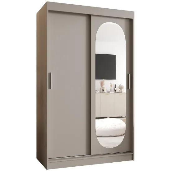 Szafa Royal 120 kaszmir to idealny wybór dla osób poszukujących praktycznej, dwudrzwiowej szafy przesuwnej z lustrem w stonowanej, beżowej kolorystyce. Doskonale sprawdzi się jako mebel do sypialni lub garderoby, wprowadzając do wnętrza ciepło, porządek i harmonijną estetykę.