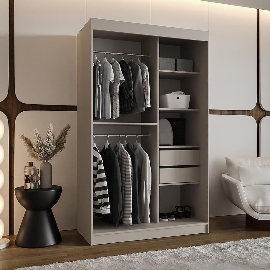 Dwudrzwiowa konstrukcja z drzwiami przesuwnymi umożliwia komfortowy dostęp do wnętrza szafy, bez potrzeby pozostawiania dodatkowej przestrzeni przed meblem. Wbudowane lustro wspiera codzienne przygotowania i optycznie powiększa pomieszczenie, nadając wnętrzu poczucie przestronności i porządku. Matowe wykończenie frontów i korpusu podkreśla elegancki i subtelny charakter mebla.