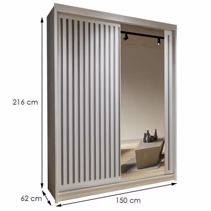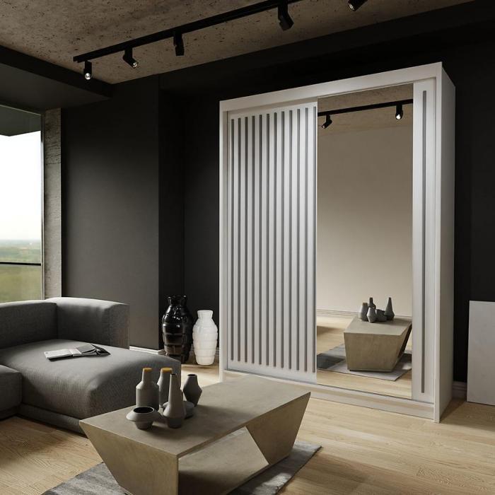 Szafa z drzwiami przesuwnymi/uchylnymi w kolorze białym/szarym z kolekcji Royal to doskonała propozycja do pokoju dziennego, ale znajdzie swoje miejsce również w innym pomieszczeniu, jak na przykład - przedpokój czy garderobie, sypialni. Materiał wykonania to płyta laminowana. Szafa posiada półki, drążek na ubrania. Duża szafa posiada również lustro, które sprawi, że pomieszczenie stanie się optycznie większe. Wygląd szafy sprawi, że wpasuje się w większość aranżacji. Szafa będzie świetnym miejscem do wieszania ubrań, na buty lub inne domowe tekstylia. Nowoczesny styl mebli wpadnie do gustu każdemu, kto poszukuje eleganckiego, klasycznego, a zarazem nowoczesnego umeblowania. Szafa przeznaczona do samodzielnego montażu.