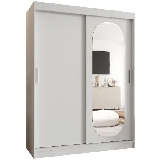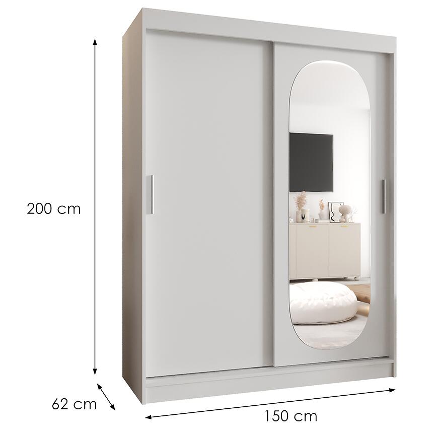 Szafa Royal 150 biały to idealny wybór dla osób poszukujących praktycznej, dwudrzwiowej szafy przesuwnej z lustrem. Doskonale sprawdzi się jako mebel do sypialni lub garderoby, wprowadzając do wnętrza świeżość, porządek i harmonijną estetykę.