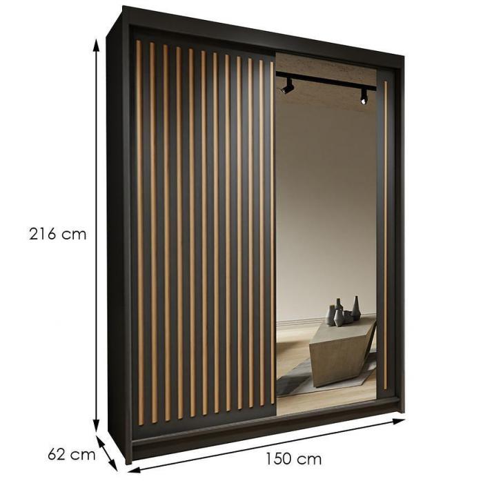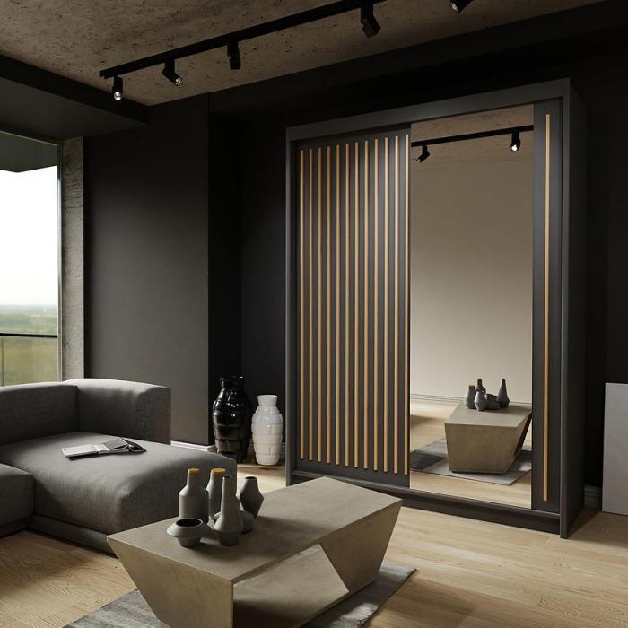 Szafa z drzwiami przesuwnymi/uchylnymi w kolorze czarnym/dąb wotan z kolekcji Royal to doskonała propozycja do pokoju dziennego, ale znajdzie swoje miejsce również w innym pomieszczeniu, jak na przykład - przedpokój czy garderobie, sypialni. Materiał wykonania to płyta laminowana. Szafa posiada półki, drążek na ubrania. Duża szafa posiada również lustro, które sprawi, że pomieszczenie stanie się optycznie większe. Wygląd szafy sprawi, że wpasuje się w większość aranżacji. Szafa będzie świetnym miejscem do wieszania ubrań, na buty lub inne domowe tekstylia. Nowoczesny styl mebli wpadnie do gustu każdemu, kto poszukuje eleganckiego, klasycznego, a zarazem nowoczesnego umeblowania. Szafa przeznaczona do samodzielnego montażu.