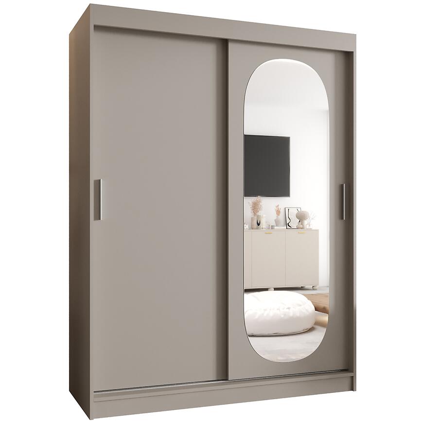 Dwudrzwiowa konstrukcja z drzwiami przesuwnymi umożliwia wygodny dostęp do wnętrza szafy bez potrzeby pozostawiania dodatkowej przestrzeni przed meblem. Wbudowane lustro wspiera codzienne przygotowania i optycznie powiększa pomieszczenie, nadając wnętrzu poczucie przestronności i porządku. Matowe wykończenie frontów i korpusu podkreśla elegancki i subtelny wygląd mebla.