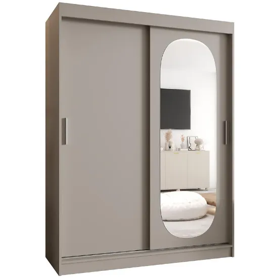 Szafa Royal 150 kaszmir to idealny wybór dla osób poszukujących praktycznej, dwudrzwiowej szafy przesuwnej z lustrem w stonowanej, beżowej kolorystyce. Doskonale sprawdzi się jako mebel do sypialni lub garderoby, wprowadzając do wnętrza ciepło, porządek i harmonijną estetykę.