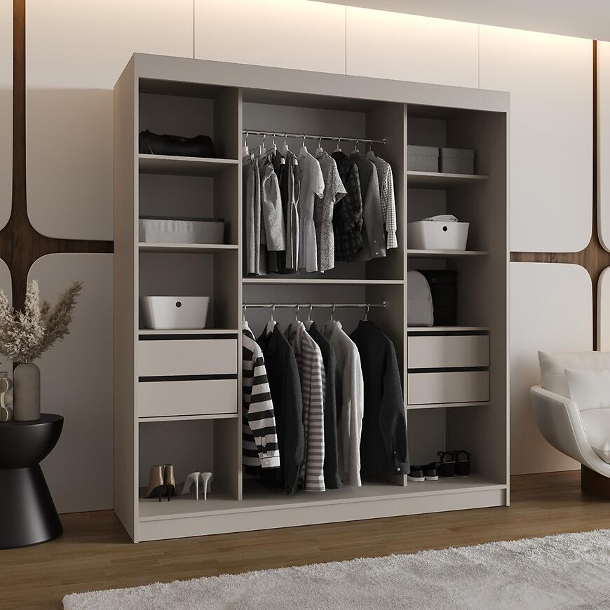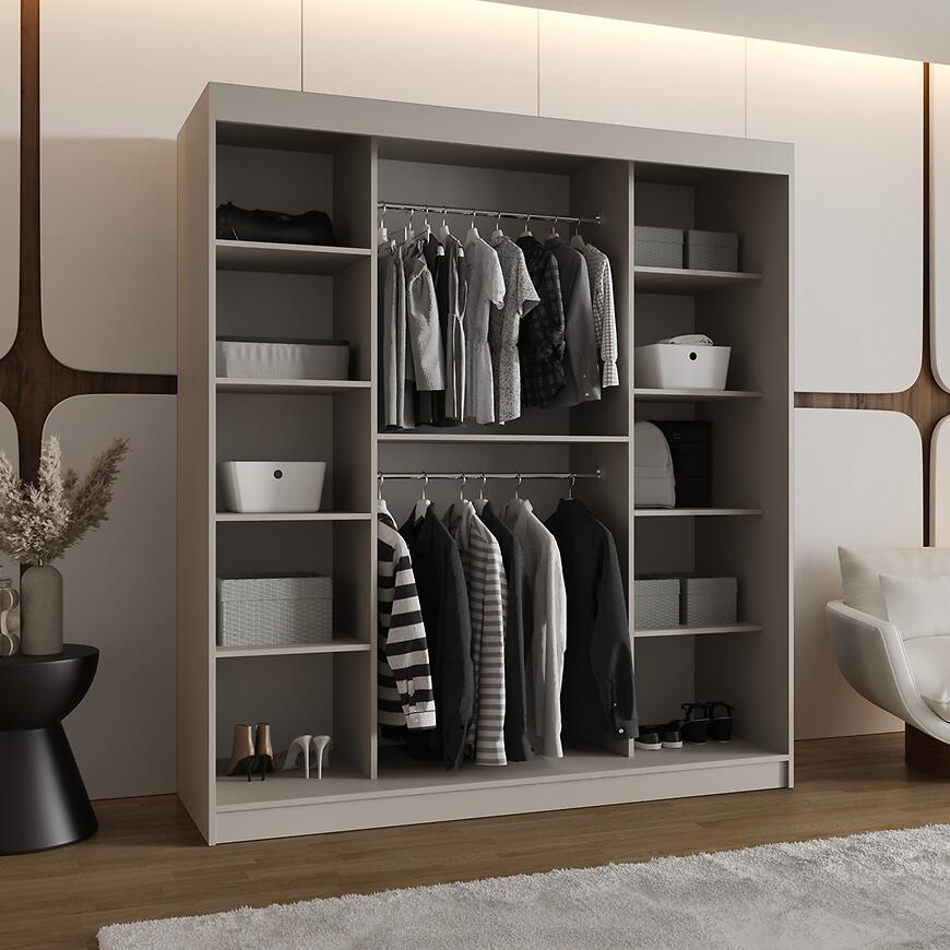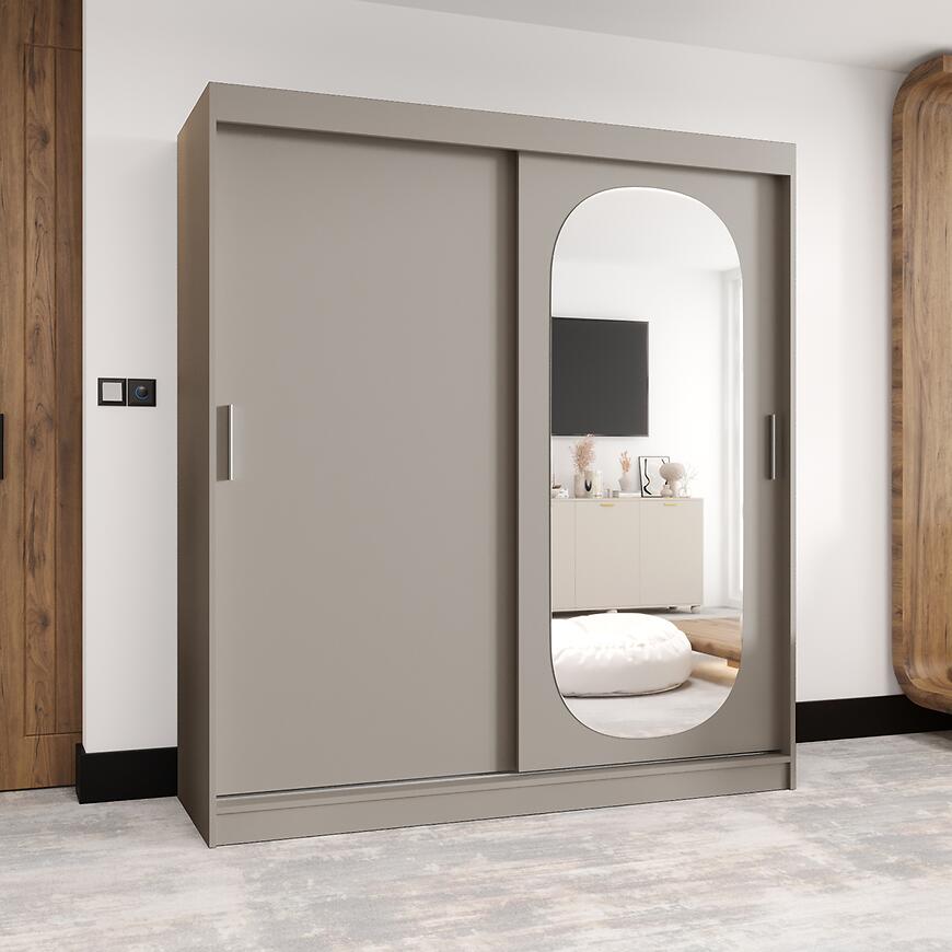 Dwudrzwiowa konstrukcja z drzwiami przesuwnymi umożliwia wygodny dostęp do wnętrza szafy bez potrzeby pozostawiania dodatkowej przestrzeni przed meblem. Wbudowane lustro wspiera codzienne przygotowania i optycznie powiększa pomieszczenie, nadając wnętrzu poczucie przestronności i porządku. Matowe wykończenie frontów i korpusu podkreśla elegancki i subtelny wygląd mebla.