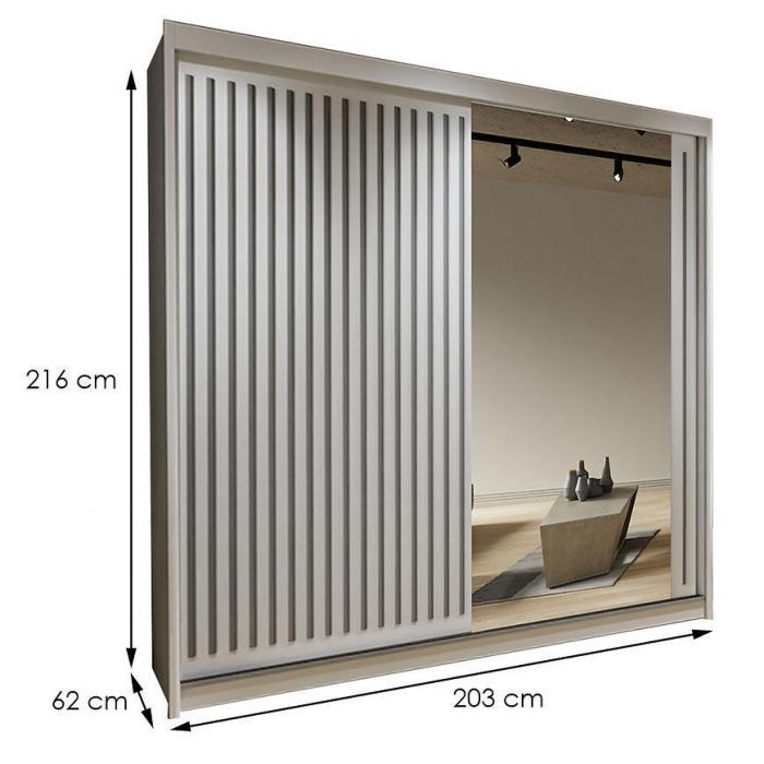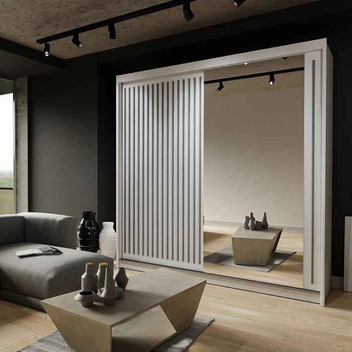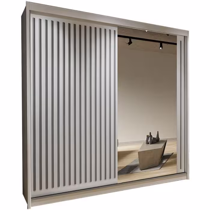 Szafa z drzwiami przesuwnymi/uchylnymi w kolorze białym/szarym z kolekcji Royal to doskonała propozycja do pokoju dziennego, ale znajdzie swoje miejsce również w innym pomieszczeniu, jak na przykład - przedpokój czy garderobie, sypialni. Materiał wykonania to płyta laminowana. Szafa posiada półki, drążek na ubrania. Duża szafa posiada również lustro, które sprawi, że pomieszczenie stanie się optycznie większe. Wygląd szafy sprawi, że wpasuje się w większość aranżacji. Szafa będzie świetnym miejscem do wieszania ubrań, na buty lub inne domowe tekstylia. Nowoczesny styl mebli wpadnie do gustu każdemu, kto poszukuje eleganckiego, klasycznego, a zarazem nowoczesnego umeblowania. Szafa przeznaczona do samodzielnego montażu.