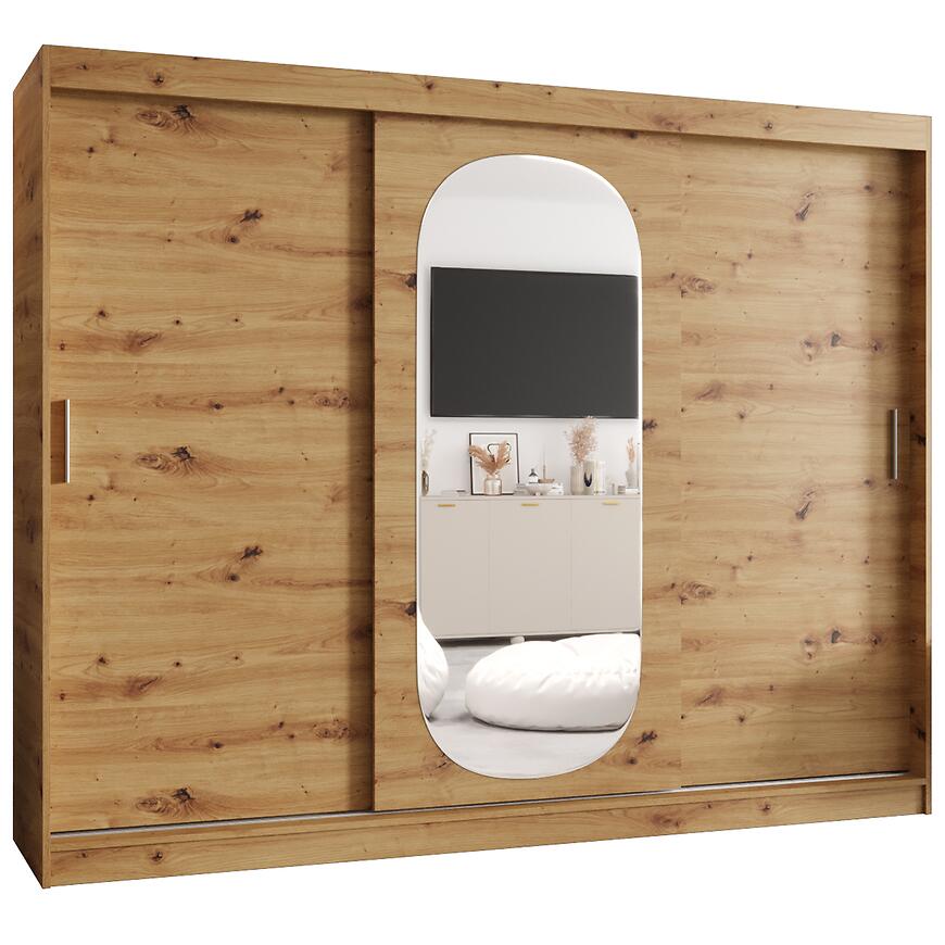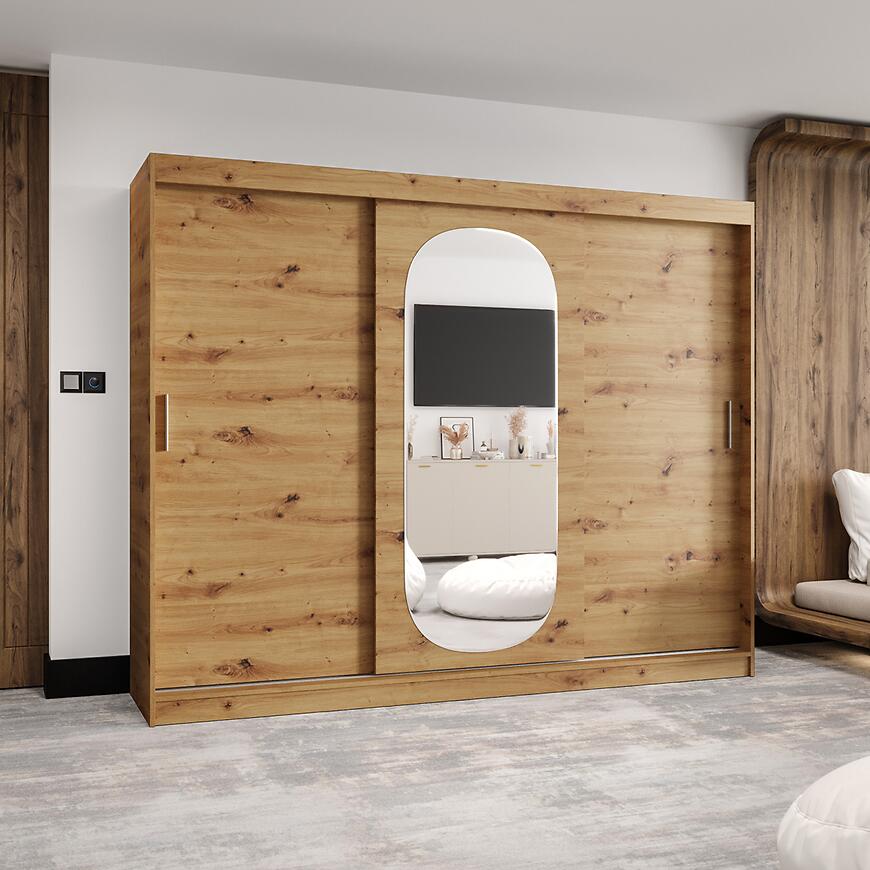 Szafa Royal 250 artisan to idealny wybór dla osób poszukujących dużej szafy przesuwnej z lustrem, która łączy naturalny wygląd drewna z nowoczesną formą. Doskonale sprawdzi się jako główny mebel do przechowywania w sypialni lub garderobie, zapewniając komfort użytkowania i estetyczny wygląd przestrzeni.