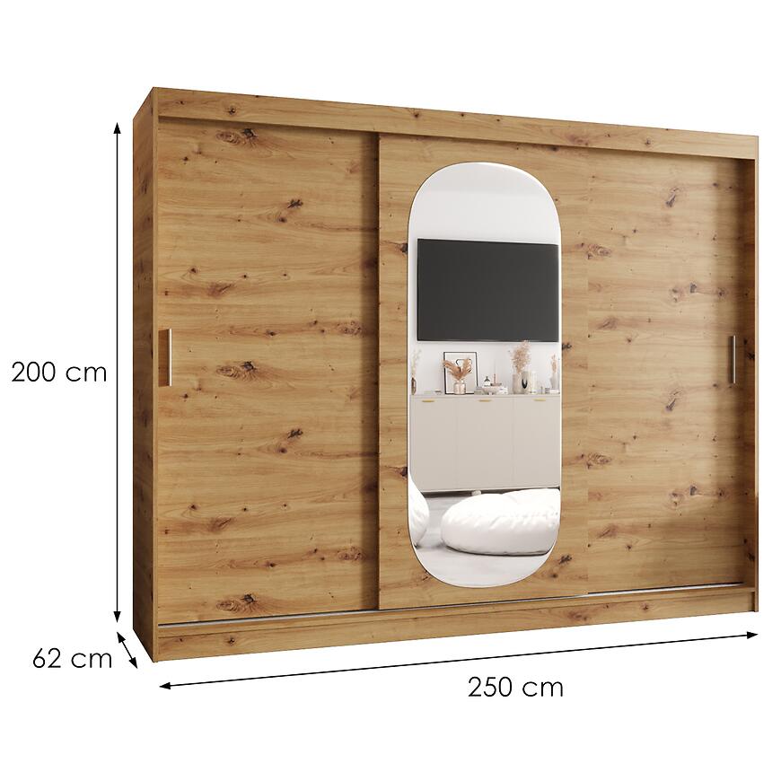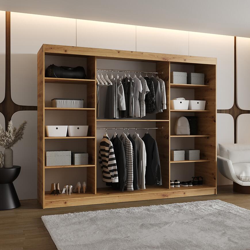 Szafa Royal 250 artisan to propozycja dla osób, które potrzebują maksymalnej przestrzeni do przechowywania, zachowując jednocześnie spójną i estetyczną aranżację wnętrza. Model z kolekcji ROYAL wyróżnia się szerokością 250 cm, dzięki czemu doskonale sprawdzi się w dużej sypialni, garderobie lub przestronnym przedpokoju. Jasne, drewnopodobne wybarwienie dąb artisan wprowadza do wnętrza ciepło i naturalny charakter, który dobrze komponuje się z nowoczesnymi aranżacjami.