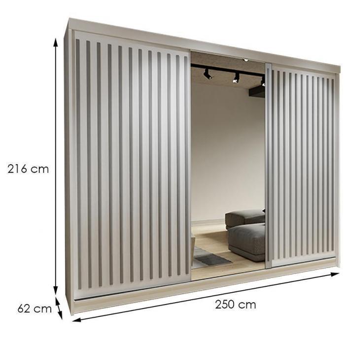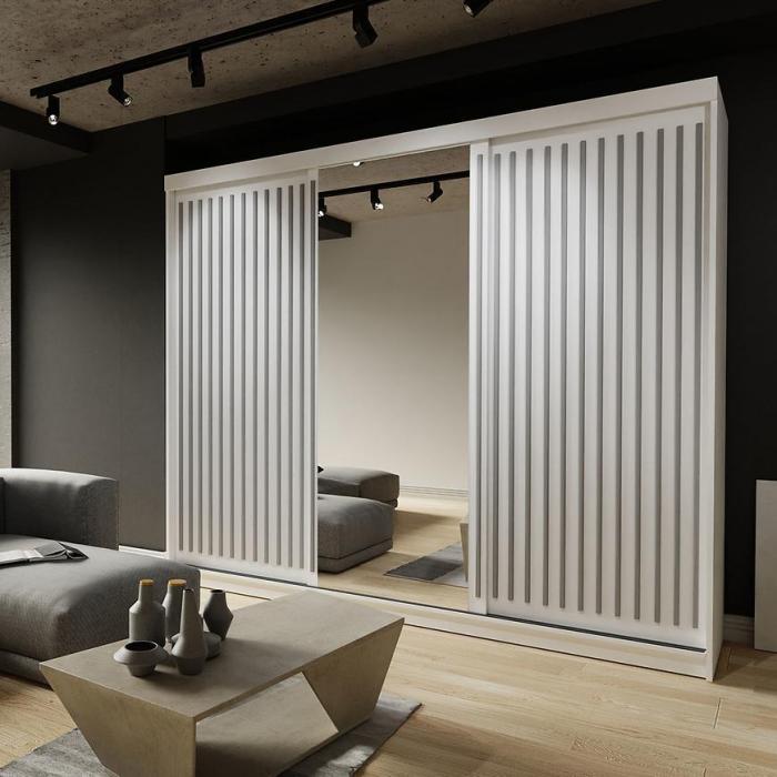 Szafa z drzwiami przesuwnymi/uchylnymi w kolorze białym/szarym z kolekcji Royal to doskonała propozycja do pokoju dziennego, ale znajdzie swoje miejsce również w innym pomieszczeniu, jak na przykład - przedpokój czy garderobie, sypialni. Materiał wykonania to płyta laminowana. Szafa posiada półki, drążek na ubrania oraz szuflady. Duża szafa posiada również lustro, które sprawi, że pomieszczenie stanie się optycznie większe. Wygląd szafy sprawi, że wpasuje się w większość aranżacji. Szafa będzie świetnym miejscem do wieszania ubrań, na buty lub inne domowe tekstylia. Nowoczesny styl mebli wpadnie do gustu każdemu, kto poszukuje eleganckiego, klasycznego, a zarazem nowoczesnego umeblowania. Szafa przeznaczona do samodzielnego montażu.