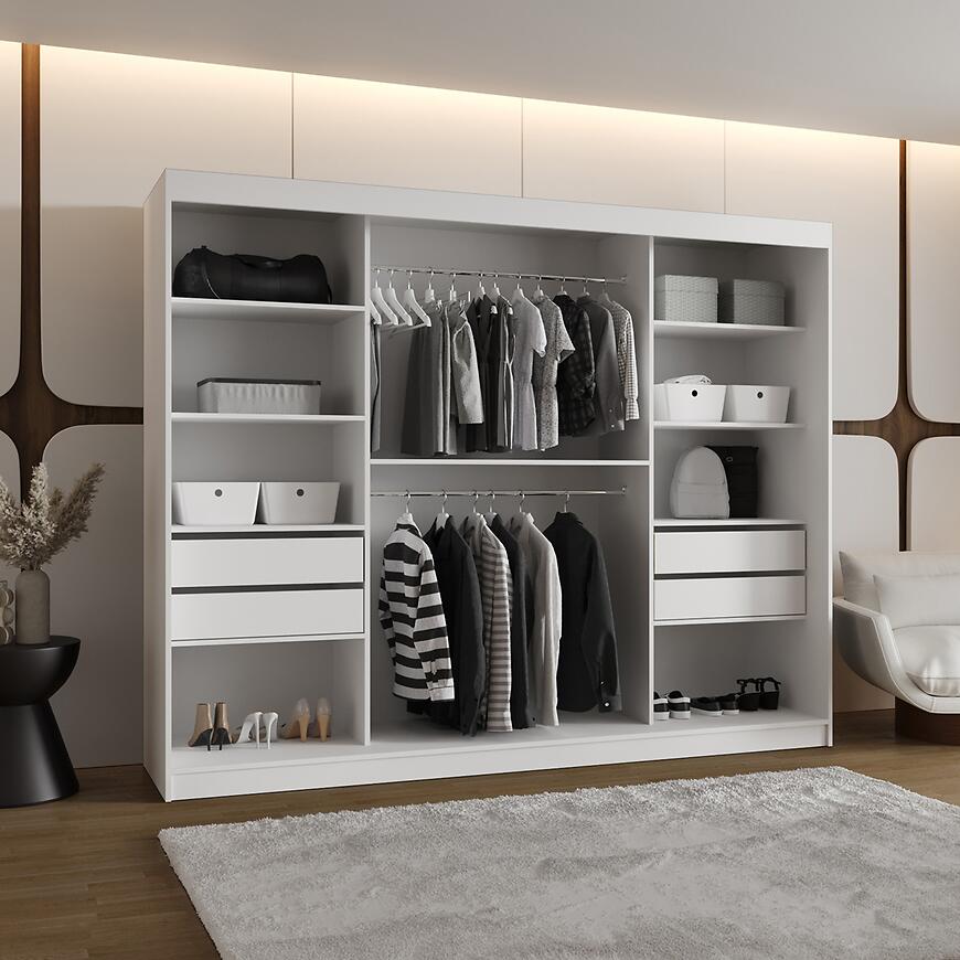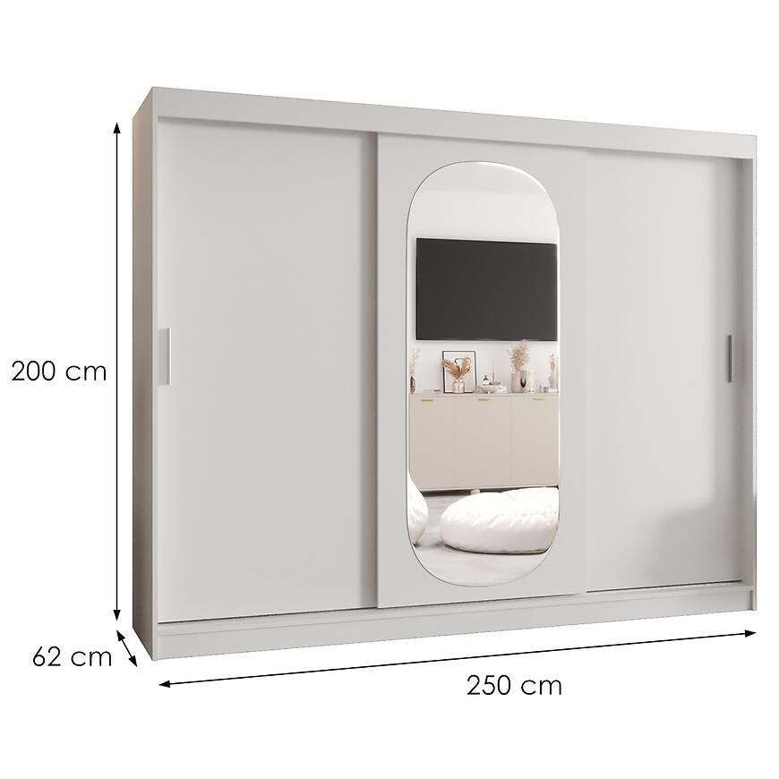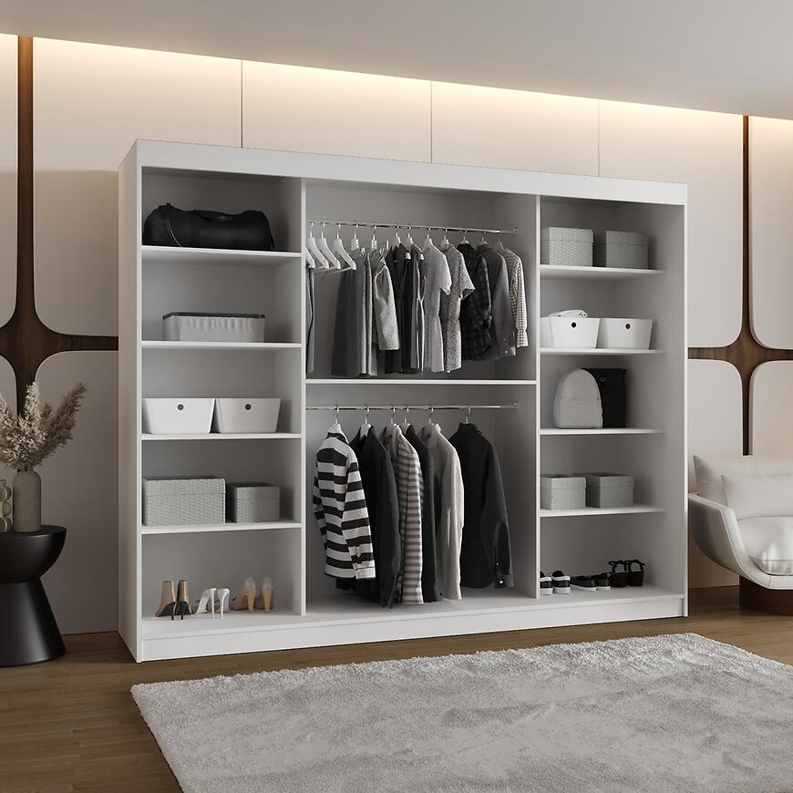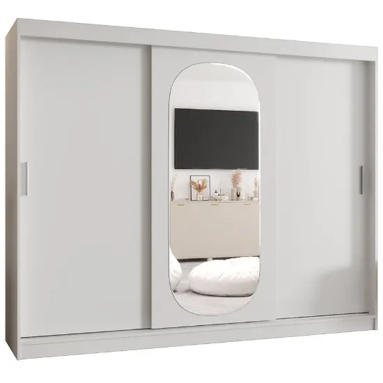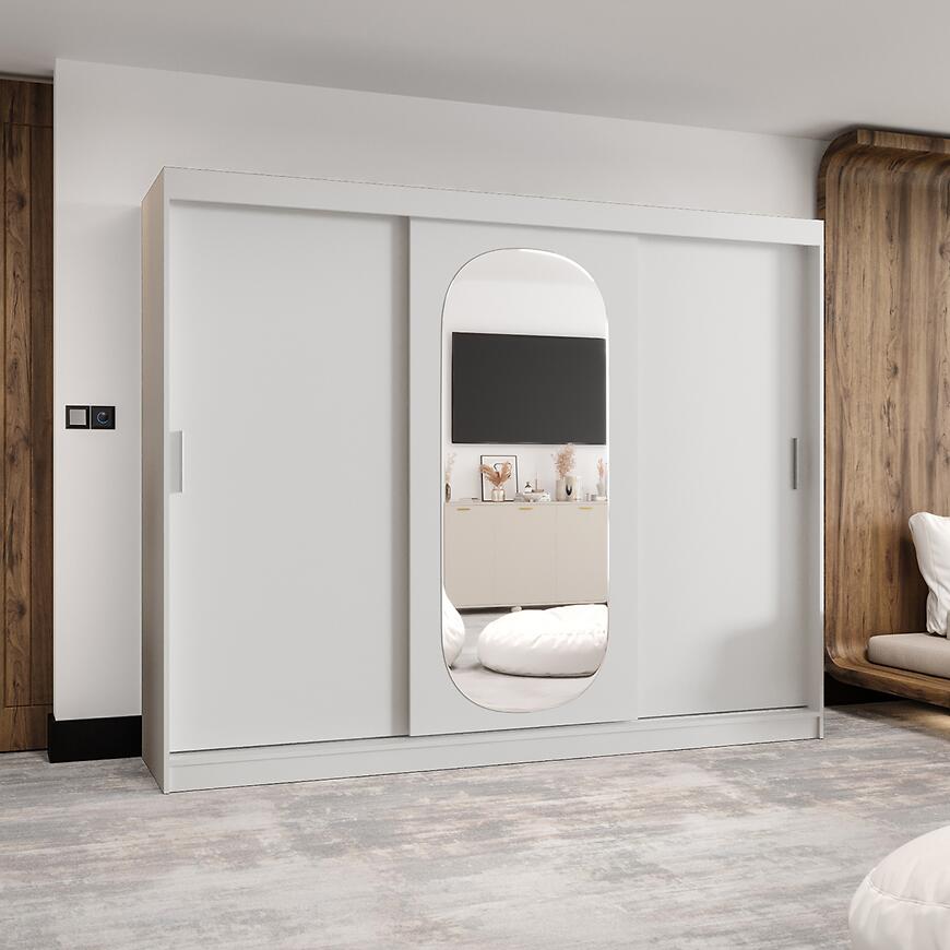 Szafa Royal 250 biały to doskonały wybór dla osób poszukujących pojemnej szafy przesuwnej z lustrem, która łączy funkcjonalność z eleganckim, jasnym wykończeniem. Sprawdzi się zarówno jako główny mebel do przechowywania w sypialni, jak i praktyczna szafa do garderoby, podkreślając harmonijny charakter wnętrza.