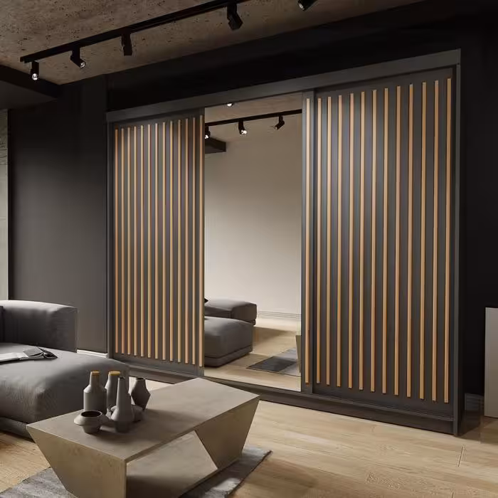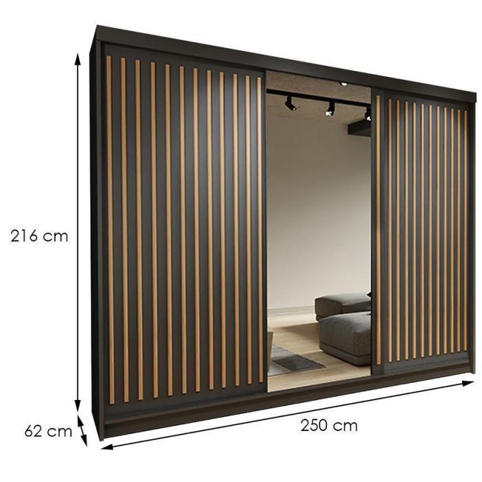 Szafa z drzwiami przesuwnymi/uchylnymi w kolorze czarny/dąb wotan z kolekcji Royal to doskonała propozycja do pokoju dziennego, ale znajdzie swoje miejsce również w innym pomieszczeniu, jak na przykład - przedpokój czy garderobie, sypialni. Materiał wykonania to płyta laminowana. Szafa posiada półki, drążek na ubrania oraz szuflady. Duża szafa posiada również lustro, które sprawi, że pomieszczenie stanie się optycznie większe. Wygląd szafy sprawi, że wpasuje się w większość aranżacji. Szafa będzie świetnym miejscem do wieszania ubrań, na buty lub inne domowe tekstylia. Nowoczesny styl mebli wpadnie do gustu każdemu, kto poszukuje eleganckiego, klasycznego, a zarazem nowoczesnego umeblowania. Szafa przeznaczona do samodzielnego montażu.