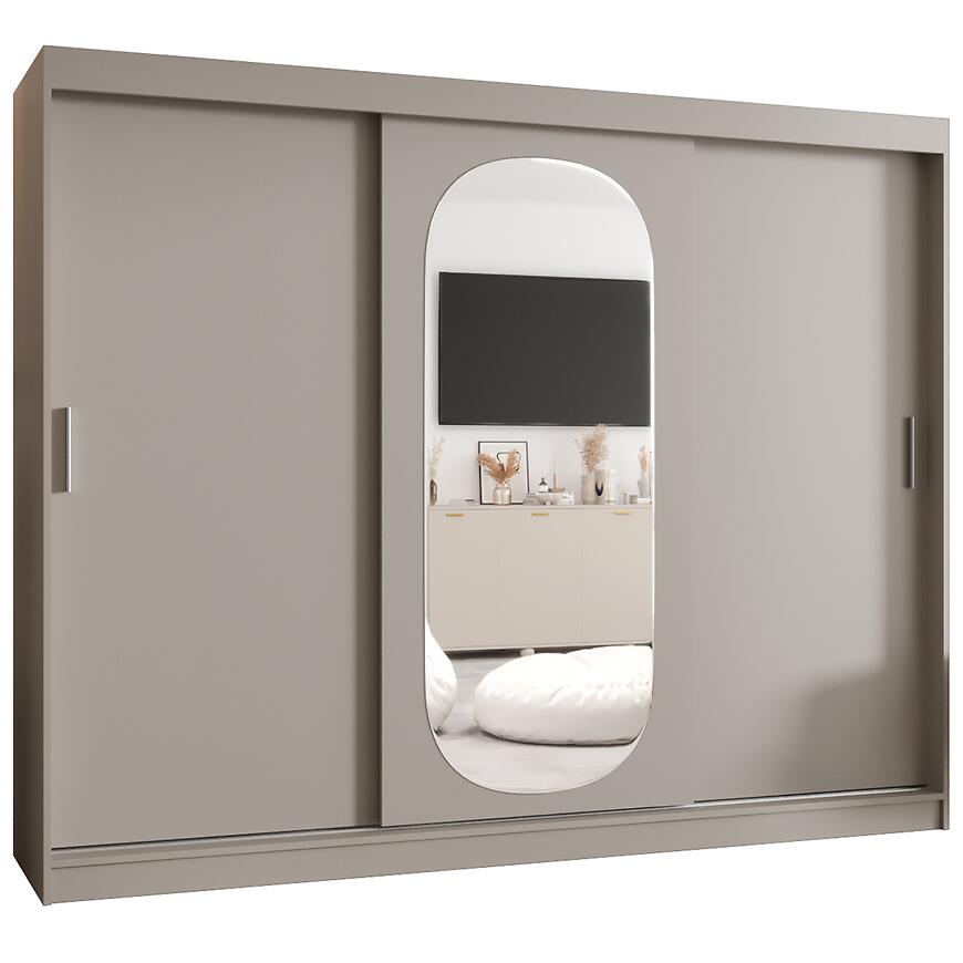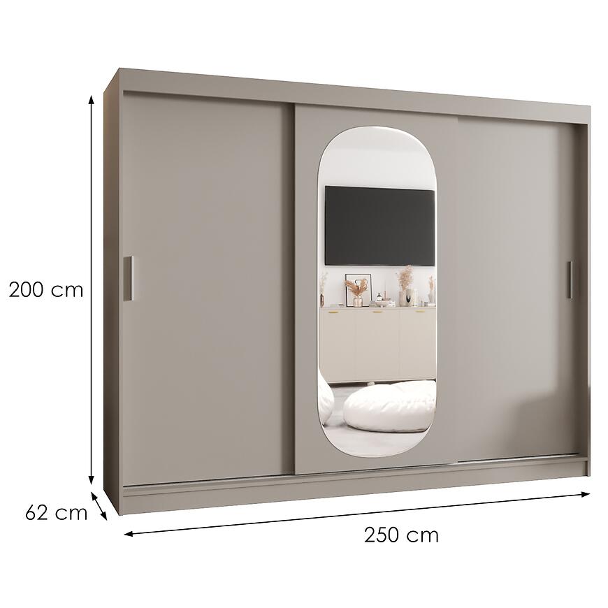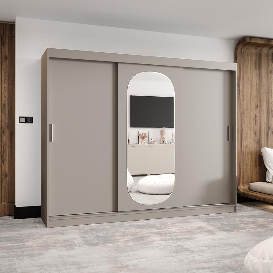 Szafa Royal 250 kaszmir to idealny wybór dla osób szukających pojemnej szafy przesuwnej z lustrem w stonowanej, beżowej kolorystyce. Doskonale sprawdzi się jako główny mebel do przechowywania w sypialni lub funkcjonalna szafa do garderoby, wprowadzając do wnętrza ciepło, porządek i harmonijną estetykę.
