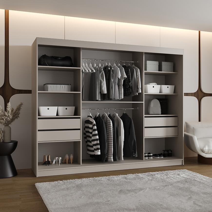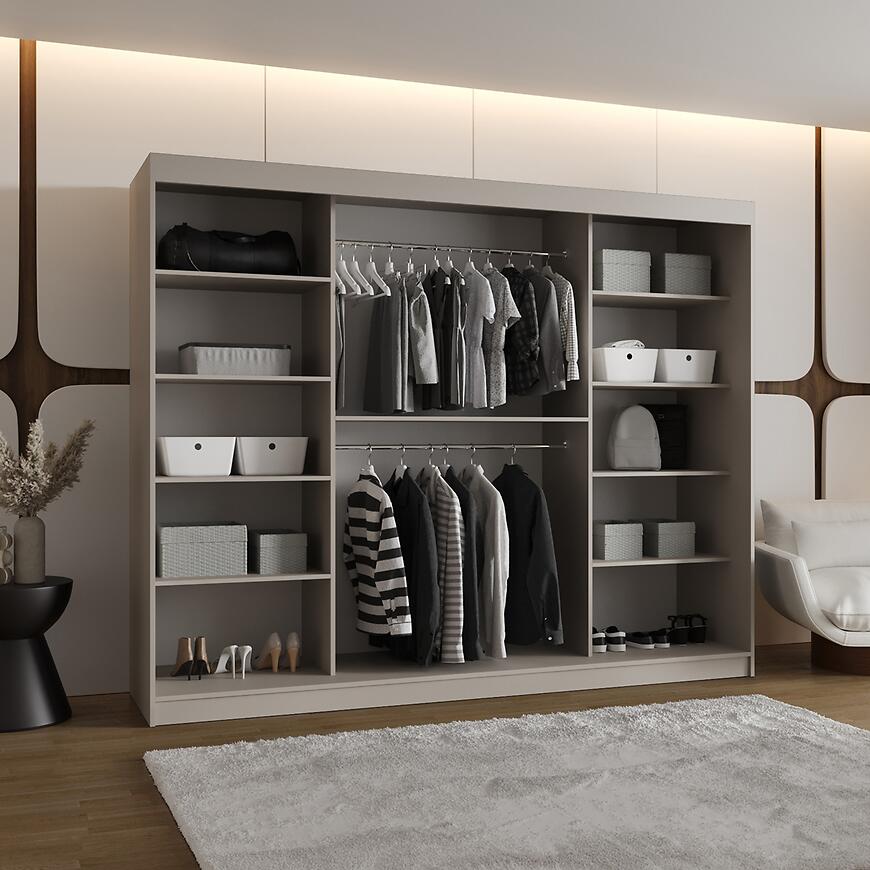Szafa Royal 250 kaszmir to elegancki i funkcjonalny mebel, który sprawdzi się w przestronnych sypialniach, garderobach i przedpokojach. Model z kolekcji ROYAL o szerokości 250 cm oferuje dużą powierzchnię do przechowywania ubrań, dodatków oraz tekstyliów domowych. Subtelny, beżowy kolor kaszmir w matowym wykończeniu wprowadza do wnętrza ciepło i przytulność, nadając nowoczesnej aranżacji elegancki, stonowany charakter.