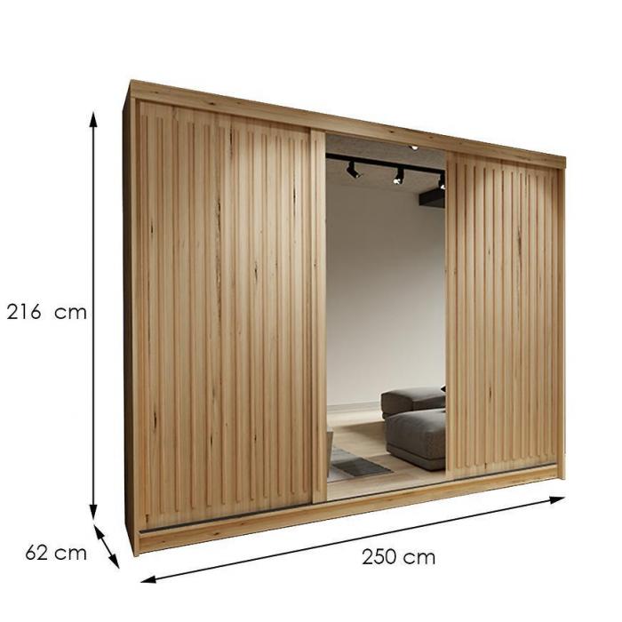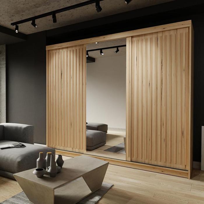 Szafa z drzwiami przesuwnymi/uchylnymi w kolorze dąb wotan z kolekcji Royal to doskonała propozycja do pokoju dziennego, ale znajdzie swoje miejsce również w innym pomieszczeniu, jak na przykład - przedpokój czy garderobie, sypialni. Materiał wykonania to płyta laminowana. Szafa posiada półki, drążek na ubrania oraz szuflady. Duża szafa posiada również lustro, które sprawi, że pomieszczenie stanie się optycznie większe. Wygląd szafy sprawi, że wpasuje się w większość aranżacji. Szafa będzie świetnym miejscem do wieszania ubrań, na buty lub inne domowe tekstylia. Nowoczesny styl mebli wpadnie do gustu każdemu, kto poszukuje eleganckiego, klasycznego, a zarazem nowoczesnego umeblowania. Szafa przeznaczona do samodzielnego montażu.