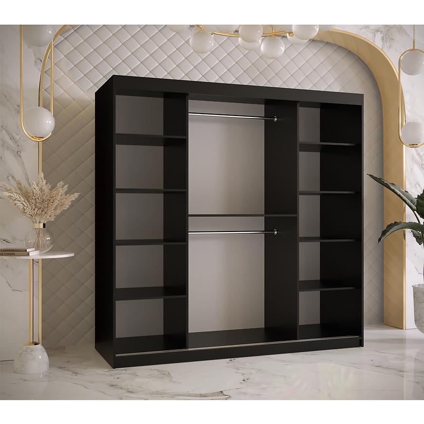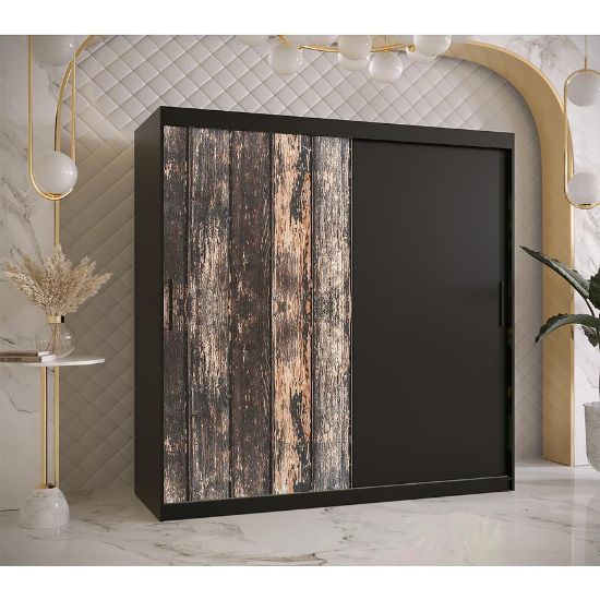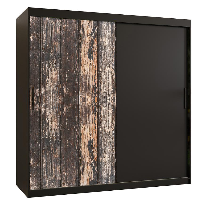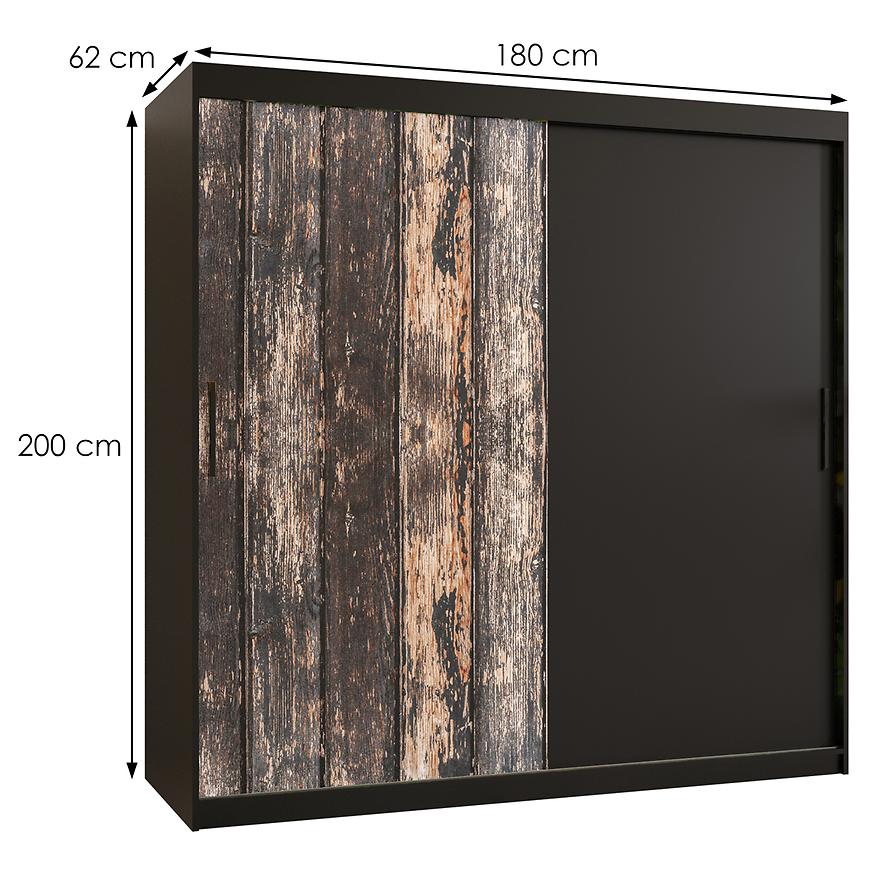 Prowadnice aluminiowe zapewniają płynne i ciche przesuwanie drzwi, co sprawia, że korzystanie z szafy jest nie tylko praktyczne, ale również komfortowe. Uchwyty z tworzywa sztucznego w eleganckim kolorze czarnym to funkcjonalny element, który nadaje szafie nowoczesnego charakteru, zachowując jednocześnie rustykalny styl.