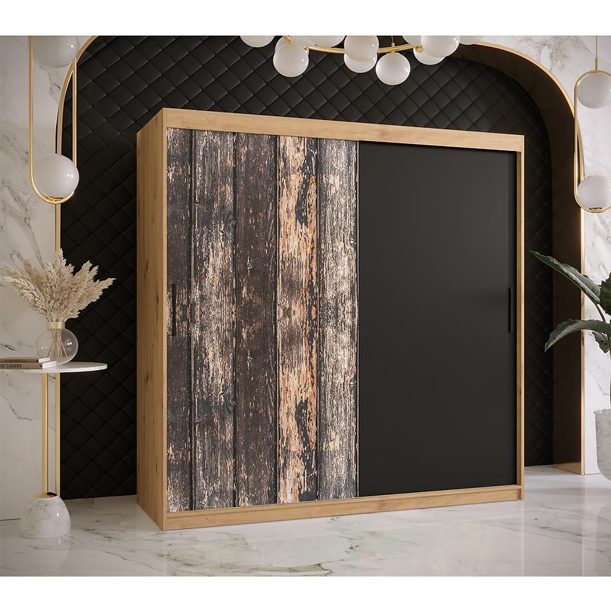 Prowadnice aluminiowe zapewniają płynne i ciche przesuwanie drzwi, co sprawia, że korzystanie z szafy jest nie tylko praktyczne, ale również komfortowe. Uchwyty z tworzywa sztucznego w eleganckim kolorze czarnym to funkcjonalny element, który nadaje szafie nowoczesnego charakteru, zachowując jednocześnie rustykalny styl.