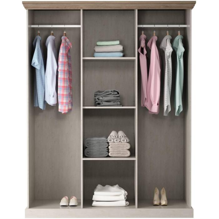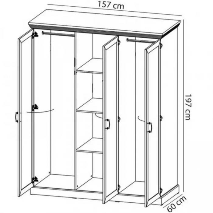 Trzydrzwiowa szafa z lustrem z kolekcji Royal S2D. W środku dwa drążki na ubrania oraz trzy półki. Na środkowych drzwiach lustro. Wykonana z płyty wiórowej laminowanej odpornej na uszkodzenia. Uchwyty metalowe w kolorze złota. Przeznaczona do samodzielnego montażu.
