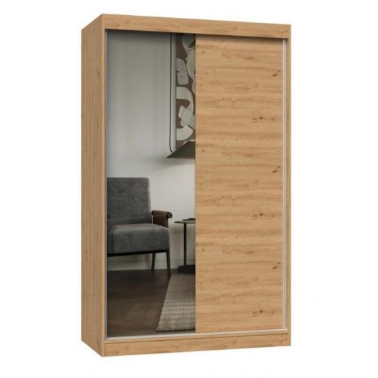 Szafa przesuwna w kolorze dąb artisan to propozycja do pokoju dziennego, ale znajdzie swoje miejsce również w innym pomieszczeniu, jak na przykład - przedpokój czy garderobie. Materiał wykonania to płyta laminowana. Szafa posiada półki oraz drążek na ubrania. Mebel posiada lustro, które sprawi, że pomieszczenie stanie się optycznie większe. Nowoczesny styl mebli wpadnie do gustu każdemu, kto poszukuje eleganckiego, klasycznego, a zarazem nowoczesnego umeblowania. Idealnie wpasuje się w większość aranżacji. Przeznaczona do samodzielnego montażu.