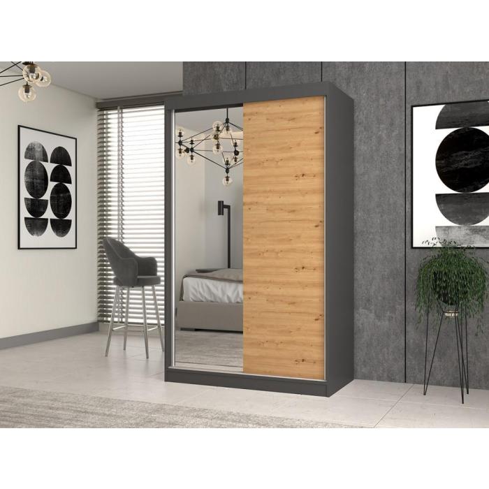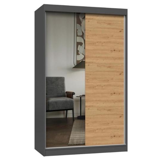 Szafa przesuwna w kolorze dąb artisan/antracyt to propozycja do pokoju dziennego, ale znajdzie swoje miejsce również w innym pomieszczeniu, jak na przykład - przedpokój czy garderobie. Materiał wykonania to płyta laminowana. Szafa posiada półki oraz drążek na ubrania. Mebel posiada lustro, które sprawi, że pomieszczenie stanie się optycznie większe. Nowoczesny styl mebli wpadnie do gustu każdemu, kto poszukuje eleganckiego, klasycznego, a zarazem nowoczesnego umeblowania. Idealnie wpasuje się w większość aranżacji. Przeznaczona do samodzielnego montażu.