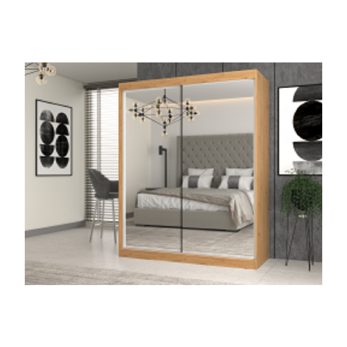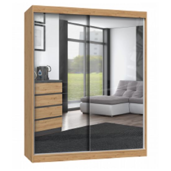 Szafa przesuwna w kolorze dąb artisan z lustrem to propozycja do pokoju dziennego, ale znajdzie swoje miejsce również w innym pomieszczeniu, jak na przykład - przedpokój czy garderobie. Materiał wykonania to płyta laminowana. Szafa posiada półki oraz drążek na ubrania. Nowoczesny styl mebli wpadnie do gustu każdemu, kto poszukuje eleganckiego, klasycznego, a zarazem nowoczesnego umeblowania. Idealnie wpasuje się w większość aranżacji. Przeznaczona do samodzielnego montażu.