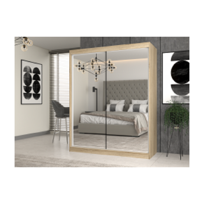 Szafa przesuwna w kolorze dąb sonoma z lustrem to propozycja do pokoju dziennego, ale znajdzie swoje miejsce również w innym pomieszczeniu, jak na przykład - przedpokój czy garderobie. Materiał wykonania to płyta laminowana. Szafa posiada półki oraz drążek na ubrania. Nowoczesny styl mebli wpadnie do gustu każdemu, kto poszukuje eleganckiego, klasycznego, a zarazem nowoczesnego umeblowania. Idealnie wpasuje się w większość aranżacji. Przeznaczona do samodzielnego montażu.